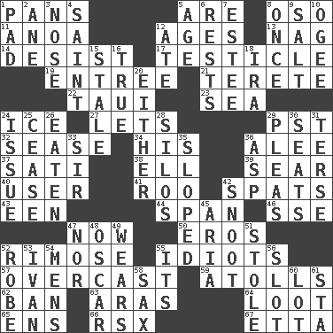 ACROSS 1. Baking dishes 5. "We ___ not amused" (Victoria) 8. Bear (Spanish) 11. Small Philippine buffalo 12. Eons 13. Tired old horse 14. Cease 17. A testis 19. Main course 21. Cylindrical with tapered ends 22. "Change" in Tahitian 23. Ocean 24. Frozen water 27. Allows 29. Pacific Standard Time (abbr.) 32. Gospel singer Marvin 34. Part of HMS, perhaps 36. Toward shelter 37. Suttee (variant) 38. Pipe bend 39. Burn superficially 40. One who uses or employs something 41. Friend of Pooh 42. Arguments over trivial matters 43. Car or cant ending 44. Connect, as a bridge 46. Compass dir. 47. At this time 50. Greek god of love 52. Full of chinks, cracks, or crevices 55. Foolish or stupid persons 57. Cloudy 59. Ringlike coral islands and reefs 62. Prohibit 63. Ancient river in northeast Turkey 64. Plunder 65. Followers of ems 66. Acura sports coupe 67. Singer James DOWN 1. Writing tablet 2. One (Scot) 3. Olfactory organ 4. Virtuous person 5. Grow older 6. Musical pauses 7. First name in cosmetics 8. At one time in the past 9. Table seasoning 10. Double curve, resembling the letter S 12. Had dinner 15. Lacking originality or spontaneity 16. Loyal 18. Lyricist Gershwin 20. One or the other of two 24. Come out of 25. Desist 26. Ingested 28. Grain storage towers 29. Entreaties 30. Theater features 31. Laconic 33. Title for a knight 35. Had an oblique or slanted direction 36. Cleo's killer 42. Snob 45. Operatic vocal solo 47. Not either 48. Motion picture award 49. Puts on (as clothing) 51. Took without asking 52. Loose flowing garment 53. _ the terrible 54. Not women's 55. ___ a Wonderful Life 56. Notch 58. Saxophone 60. Car dealer's back yard 61. R.R. building