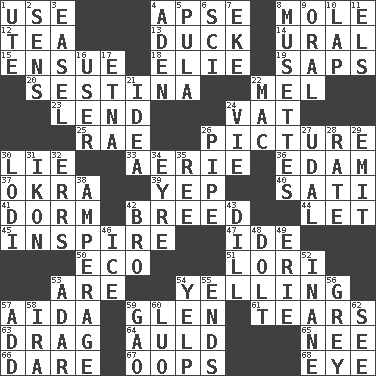 ACROSS 1. Purpose 4. Domed church section 8. Undercover agent 12. Afternoon social gathering 13. Evade 14. Mountain range 15. Follow as a consequence or result 18. Writer Wiesel 19. Plant excrements 20. French poetic form 22. Cartoonist voice _ Blanc 23. Grant temporary use of 24. Large container 25. Actress Charlotte 26. Photo 30. Untruth 33. Nest on high 36. Dutch treat 37. Gumbo ingredient 39. Slangy assent 40. Suttee (variant) 41. Dormintory (informal) 42. A special lineage 44. Allow 45. Stimulate to action 47. Binary compound 50. Environmental prefix 51. Australian parrot (variant) 53. "We ___ not amused" (Victoria) 54. Crying or shouting loudly 57. Opera by Verdi 59. Small, secluded valley 61. Separates forcefully 63. To be drawn or hauled along 64. Old (Scot.) 65. Born 66. Have the gumption 67. I made a mistake 68. Sight organ DOWN 1. Shoshoni 2. Elected reps. 3. Artist's stand 4. Arabian gulf 5. Monetary unit of Botswana 6. _-fi 7. Supplement with great effort 8. French bagpipes 9. Taken by mouth 10. Infant locale 11. Raised railways 16. One who makes use of a thing 17. Inactive volcano in Sicily 21. It may be bright or harebrained 22. Big _ 24. Compete 26. Corncob 27. Allodial 28. Assign a rank or rating to 29. Give off 30. Farming town in central California 31. Image 32. Blunders 34. Jane of fiction 35. Portuguese money of account (variant) 38. Electrical Measurement 42. Sis' sibling 43. Deli pickle 46. Frozen water 48. Stupid person 49. 4th largest of the Great Lakes 52. Empty; void 53. The sixth month of the Jewish calendar 54. Sharp bark 55. Conclusions 56. Jennifer or Joel 57. Find the sum of 58. Retirement account (abbr.) 59. E Mali city 60. Nilotic language 62. Perceive with the eye