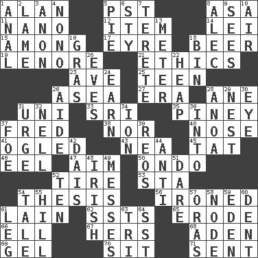 ACROSS 1. Actor Alda or Thicke 5. Pacific Standard Time (abbr.) 8. White ___ sheet 11. Billionth: prefix 12. A whole individual unit 14. Luau accessory 15. Amid 17. Jane of fiction 18. Fermented drink made from hops 19. Poe poem 21. Principles of right and wrong 23. "___ Maria" 25. Adolescent 26. At sea 27. Epoch 28. A saturated hydrocarbon 31. Corn or form start 33. Indian title of respect (Mr.) 35. Abounding in pines 37. Flintstone 38. Or not 40. Olfactory organ 41. Stared 43. Teachers' org. 45. Make lace 46. Snakelike fish 47. Direct toward a target or goal 50. Southwest Nigerian state 52. Become fatigued 53. R.R. building 54. College paper 56. Pressed 61. (Had) reclined 62. Fast planes 65. Eat (away) 66. Pipe bend 67. Possessive pronoun 68. An important port of Yemen 69. Set 70. Be seated 71. Transmitted DOWN 1. Of or related to the anus 2. Unable to walk 3. At once, immediately (arch.) 4. Words to Nanette 5. Sliced dessert 6. Filthy place 7. Cylindrical with tapered ends 8. Actor Baldwin 9. Observes 10. Wind 13. Distance measurement 16. Pate de foie ____ 18. Storage container 20. Nights before holidays 22. Pile 24. Merit 26. Assistant 28. Small Philippine buffalo 29. A home for chicks 30. Sight organ 31. Goad 32. 1994 drama film starring Jodie Foster 34. Electrically charged atom 36. To the inside or interior of 37. Enemy 39. Vintage cars 42. Raised platform 44. Against 48. From or relating to Ireland 49. Makes clutter 51. Have the gumption 52. "___ Little Indians" 54. Lie 55. Land elevation 57. Mouths or openings 58. Connecting point 59. Locale of original sin 60. Gouge 61. Part of a journey 63. Three (prefix) 64. Fast jet (abbr.)