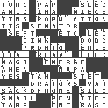 ACROSS 1. Torque (variant) 5. Infant food 8. Downhill vehicle 12. Among 13. _ tizzy (2 wds.) 14. Sibling's daughter 15. Canisters 16. Census information 19. It is 20. Elected representative 21. Back-to-school mo. 23. And so on (abbr.) 24. Lion 27. Pig sound 30. Texas town _ City 31. Right away 34. One of the Great Lakes 35. Slanted text style (abbr.) 38. Rob, plunder, or pillage 40. Nourish 41. Wise men 42. Develop 44. So be it 45. California wine valley 46. Affirmative reply 47. The 23rd letter of the Hebrew alphabet 50. Proofreading order 53. Speakers 57. Large container 59. Italian handbag shop? 63. Grain storage tower 64. Slow-paced one 65. Animal enclosure 66. A whole individual unit 67. Canvas cover 68. Compass dir. 69. Raze (variant) DOWN 1. Jacques of French films 2. Leaves out 3. Wash lightly 4. Music discs 5. Corncob 6. At once, immediately (arch.) 7. Dad 8. Be seated 9. Luau accessory 10. Environmental prefix 11. Lair 14. Drug cop 17. Shoshoni 18. Car dealer's back yard 20. Move through with a circular motion 22. Cotton for raincoats, e.g. 24. Old wives' tales, e.g. 25. Singer Brickell 26. Wrote a lyric poem 28. Or not 29. Leg joint 30. Outscore 32. Scottish cap 33. Baking chamber 35. "If ____ say so..." 36. Docile 37. Matures 39. Period 43. Global Positioning Systems (abbr.) 47. Implement 48. Sandy's bark 49. Armed conflict 51. Webber/Rice musical 52. Lies 54. Drink excessively 55. Sign of things to come 56. French philosopher Descartes 58. Heavy book 59. Fast jet (abbr.) 60. Santa ___, CA 61. 4-wheeled motor vehicle 62. Sleep 63. Title for a knight