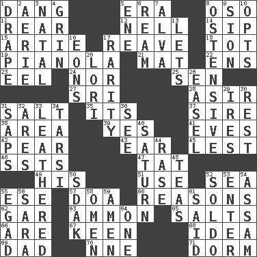 ACROSS 1. Mild oath, euphamism for damn 5. Epoch 8. Bear (Spanish) 11. Tail end 12. 1994 drama film starring Jodie Foster 14. Small drink 15. Nick name for Arthur 17. Rob, plunder, or pillage 18. Small child 19. Player piano 21. Floor covering 22. Followers of ems 23. Snakelike fish 24. Or not 25. Elected rep. 27. _ Lanka 28. SW Saudi Arabia district 31. Table seasoning 35. ___ a Wonderful Life 37. Father 38. Type of rug 39. It is so 41. Nights before holidays 42. Lightbulb-shaped fruit 43. Ewer handle 45. For fear that 46. Fast planes 47. Make lace 49. Part of HMS, perhaps 51. Purpose 52. Ocean 55. Compass dir. 57. ___ good deed 60. Thinks logically 62. Slender fish 63. ID or VA city 65. Table seasonings 66. "We ___ not amused" (Victoria) 67. Peachy ____! 68. The content of cognition 69. Male parent 70. Compass dir. 71. Dormintory (informal) DOWN 1. Window treatment 2. Nest on high 3. Relating to or accompanying birth 4. Amused look 5. Compass dir. 6. 480, 500 or 516 sheets of paper 7. Inventor's middle name 8. Clearly or manifestly demonstrative 9. The Jewish people; Israel 10. Elects 13. Allows 16. Immeasurably long periods of time 17. Noteworthy scarcity 20. Australian parrot (variant) 26. Artist's stand 29. Angers 30. State of inaction 31. Plant excrements 32. Ancient Greek god of war 33. Resembling or made to resemble leather 34. Tarsus (plural) 36. Perceive with the eye 40. Titan orbits this 44. Raze (variant) 48. Afternoon social gatherings 50. Neighbor of Neb. 52. Twentieth part of a lira 53. Keyboard key 54. Indian state 55. Mild oath 56. "Two Mules for Sister ____" 58. Presage 59. So be it 61. Expressed in words 64. Single