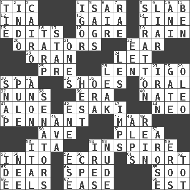 ACROSS 1. Nervous spasm 4. Austrian river, tributary to the Danube 8. Thick slice 12. _ tizzy (2 wds.) 13. Greek goddess of the earth (variant) 14. Prong on a fork 15. Prepares for publication 18. Legendary monster 19. Precipitation 20. Speakers 22. Hearing organ 23. Northwest Algerian city 24. Allow 25. Before (prefix) 26. Small, flat, pigmented spot on the skin 30. Health resort 33. Imelda's hoard 36. Of the mouth 37. Religious women 39. Epoch 40. Nathan's nickname 41. Medicinal plant 42. 1973 Nobel Price Winner (Physics) Leo 44. Modern: prefix 45. Pre-World Series prize 47. Impair 50. "___ Maria" 51. Entreaty 53. Call ___ day 54. Motivate 57. To the inside or interior of 59. Shade of tan 61. Derisive sound 63. Letter starter 64. Moved rapidly 65. "Barney Miller" actor Jack 66. Snakelike fish 67. Comfort 68. Eastern Standard Time (abbr.) DOWN 1. Make a knot 2. _ china 3. Capital of Egypt 4. Composer Stravinsky 5. Settles 6. Atmosphere 7. Actress Charlotte 8. Ski resort town in Vermont 9. One who doesn't tell the truth 10. Black tropical American cuckoo 11. Benjamin's nick name 16. Canvas cover 17. Play the lead 21. Washington bills 22. Car or cant ending 24. French article 26. Path through which fluid escapes 27. SW Asia republic 28. Yard entry 29. Butter sub 30. Fastener 31. Whine 32. Soon (poet.) 34. Command 35. Mouth or opening 38. Elected representatives 42. Compass dir. 43. Naughty children 46. Actress Gardner 48. High mountains 49. It's straight from the horse's mouth 52. Came up 53. Slanted text style (abbr.) 54. Angers 55. Unadorned 56. Greek god of love 57. Binary compound 58. Born 59. Compass dir. 60. Accounting whiz (abbr.) 62. Small child