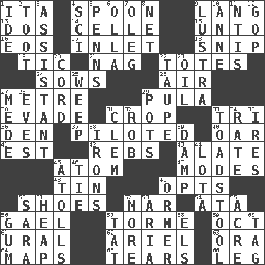 ACROSS 1. Call ___ day 4. Soup utensil 9. Long (Scottish) 13. Two (Sp.) 14. Cell (Danish) 15. To (old English) 16. Greek goddess of the dawn 17. An arm off of a larger body of water 18. Sever or remove by pinching or nipping 19. Nervous spasm 21. Tired old horse 22. Lugs 24. Sty mamas 26. Wind 27. Distance measurement (Brit.) 29. Monetary unit of Botswana 30. Elude 31. Riding implement 33. Three (prefix) 36. Lair 37. Manned the helm 40. Rowing implement 41. Eastern Standard Time (abbr.) 42. Confederate soldiers (slang) 43. Having winglike extensions 45. Tiny particle 47. Methods 48. Metal container 49. Chooses 50. Imelda's hoard 52. Impair 54. _ moment's notice (2 wds.) 56. Highlander 57. Singer Mel 59. Sep. follower 61. Mountain range 62. Satellite of Uranus 63. Mouth or opening 64. Atlas contents 65. Pulls apart 66. Part of a journey DOWN 1. Binary compound 2. A blast of a horn 3. Aide 4. _-fi 5. Actor Sean's family 6. Spanish pot 7. Cassini of fashion 8. Fish or hair follower 9. A period of five years 10. Singer Murray 11. Nuclear Threat Initiatives 12. Republican Party 20. Drawstring 22. Grayish beige 23. Petroleum 25. Shed a tear 27. Ancient Persian 28. Nights before holidays 29. Plant holders 31. Clement's nick name 32. Director Reiner 33. Inedible or poisonous agaric 34. Assign a rank or rating to 35. Angers 38. Removes the wrinkles 39. Moist 44. Globular water bottle used in Asia 45. Ringlike coral islands and reefs 46. Neckwear 49. Channel Islands abalone 50. "Two Mules for Sister ____" 51. Pile 52. Greater amount 53. Roberta Peters solo 55. Measure of real estate 56. Chewing product 57. Make lace 58. Raised railways 60. Label