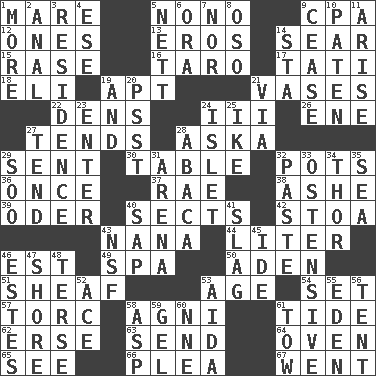 ACROSS 1. Female horse 5. Words to Nanette 9. Numbers guy (abbr.) 12. Washington bills 13. Greek god of love 14. Wither 15. Raze (variant) 16. Edible starchy tuberous root 17. Jacques of French films 18. Biblical high priest 19. Fitting 21. Flower holders 22. Lairs 24. One more than two 26. Compass dir. 27. Looks after 28. "____ silly question..." 29. Posted 30. Eating place 32. Plant holders 36. At one time in the past 37. Actress Charlotte 38. American tennis player Robert 39. River in Europe 40. Religious groups 42. Portico 43. Nanny 44. 61 cubic inches 46. Eastern Standard Time (abbr.) 49. Health resort 50. Arabian gulf 51. Archer's quiver 53. Mature 54. Arrange properly for use 57. Torque (variant) 58. Hindu god of fire 61. Periodic rise and fall of the sea level 62. Celtic language 63. Post 64. Baking chamber 65. Observe 66. Entreaty 67. Gone DOWN 1. Greater amount 2. Of or related to the anus 3. Home 4. Compass dir. 5. Remaining after all deductions 6. Mouth or opening 7. Or not 8. Bear (Spanish) 9. Desist 10. Eucharist need 11. Originate 14. R.R. building 19. Added to 20. Inconspicuous attention getter 21. By way of 23. Keyboard key 24. Small island 25. Eisenhower's nickname 27. Be inclined (to) 28. Phillipine bananalike plant 29. "Barney Miller" actor Jack 31. Sports stadium 32. Thick mixture 33. Clearly or manifestly demonstrative 34. Son of Odin 35. Ocean 40. Plant excrement 41. Volcanic refuse 43. Overdraft (abbr.) 45. Binary compound 46. _____ Park, CO 47. Dinah or Pauly 48. Laconic 52. Adept person 53. Opera by Verdi 55. Paradise 56. Portable shelter 58. Viper 59. Set 60. Compass dir. 61. Pull behind
