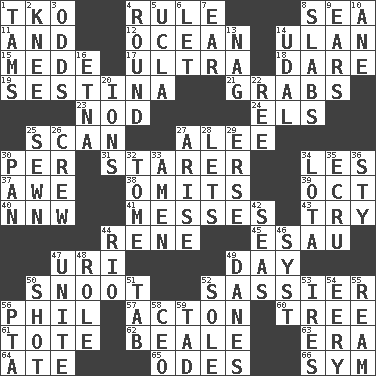 ACROSS 1. Ring climax 4. General guideline 8. Ocean 11. Also 12. Sea 14. ____ Bator, Mongolia 15. Ancient Persian 17. Extremist 18. Have the gumption 19. French poetic form 21. Takes hold of 23. Lower and raise head in agreement 24. Raised railways 25. Glance over 27. Toward shelter 30. For each 31. A viewer who gazes fixedly 34. French article 37. Deep reverence 38. Leaves out 39. Sep. follower 40. Compass dir. 41. Makes clutter 43. Attempt to accomplish something 44. French philosopher Descartes 45. He sold his birthright 47. RI univ. 49. 24 hours 50. Snob 52. More lively and spirited 56. Silvers or Donahue 57. Gambison 60. Woody plant 61. Carryall 62. Calif. Air Force Base 63. Epoch 64. Had dinner 65. Lyric poems 66. Symbol (abbr.) DOWN 1. Scottish caps 2. Leg joint 3. Likelihood 4. One shot 5. Southern CA. univ. 6. Allow 7. Ewer handle 8. Thick slices 9. Hearing organs 10. A saturated hydrocarbon 13. Tired old horse 14. Allodial 16. Inactive volcano in Sicily 20. Charged particles 22. Portuguese money of account (variant) 25. Stitched 26. Group working together 27. Ascend 28. Allows 29. Celtic language 30. Baking dish 32. Heavy book 33. So be it 34. Globular water bottle used in Asia 35. Shade of tan 36. Filthy place 42. Oceans 44. _ de Janeiro 46. System (abbr.) 47. Join together 48. Hero or heavy, e.g. 49. Natives or inhabitants of Denmark 50. Went for two points 51. Bar bill 52. Not divided or shared with others 53. Angers 54. Suggestive of the supernatural 55. 480, 500 or 516 sheets of paper 56. Parent Teacher Association (abbr.) 58. Corporate head (abbr.) 59. Small amount or degree