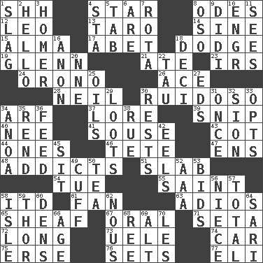 ACROSS 1. Quiet! 4. Play the lead 8. Lyric poems 12. Lion 13. Pacific island yam 14. Trig term 15. _ mater 17. Collude with 18. Evade 19. American astronaut and politician John 21. Had dinner 23. Big collection agency 24. U. of Maine site 26. Adept person 28. Famous astronaut Armstrong 30. Boisterous (Brazilian Portuguese) 34. Sandy's bark 37. Old wives' tales, e.g. 39. Sever or remove by pinching or nipping 40. Born 41. Lush 43. Small bed 44. Washington bills 46. False hair 47. Followers of ems 48. Inveterate users 51. Broad, flat, thick piece 54. Third day of the wk. 55. Virtuous person 58. It would 61. Air blower 63. Goodbye (Sp.) 65. To gather and bind into a bundle 67. Relating to the mouth 71. Stalk of a moss capsule 72. Yearn 73. Ubangi River tributary 74. Auto 75. Celtic language 76. Arranges properly for use 77. Connecticut Ivy Leaguer DOWN 1. Volcanic refuse 2. Phone greeting 3. Simpsons dad 4. R.R. building 5. Keyboard key 6. "We ___ not amused" (Victoria) 7. Round or rotation of duties 8. Bear (Spanish) 9. "You Light Up My Life" star Conn 10. Engineer (abbr.) 11. Perceives with the eye 16. At once, immediately (arch.) 18. Tenth: prefix 20. Compass dir. 22. The 19th letter of the Greek alphabet 25. Petroleums 27. Begley and Asner 29. Plunders 30. Musical pauses 31. At one time in the past 32. The Jewish people; Israel 33. Chooses 34. Small Philippine buffalo 35. Tear apart 36. Nourish 38. Sorrow 42. Snakelike fish 45. Be seated 49. Sleeve end 50. Afternoon social gathering 52. American Automobile Association (abbr.) 53. Auction offers 56. Sibling's daughter 57. Add up to 58. Small island 59. Son of Odin 60. Cub Scout units 62. Horse sense 64. Indian skirt 66. Mature 68. To riddle 69. Keyboard modifier key 70. French article