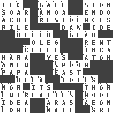 ACROSS 1. Affectionate concern, for short 4. Highlander 8. The Jewish people; Israel 12. Fly high 14. Small Philippine buffalo 15. Inside; within (prefix) 16. 43,560 square feet 17. Homes 20. Cause heat under the collar 21. Fool 22. Binary compound 23. Auction bid 27. Necklace unit 29. Cassini of fashion 31. Monthly bill 34. Cell (Danish) 35. South American Indian 36. Hindu Mythology: god of death 39. It is so 41. Smallest unit of an element 42. So be it 43. Soup utensil 46. Dad 47. 90 degrees 48. Rounded earthenware pot or jar 51. Lugs 54. Or not 56. It is 58. Son of Odin 61. Pleas 66. Thickened enlargement 67. It may be bright or harebrained 68. Caspian sea tributary 69. Period of immesurable duration 70. Old wives' tales, e.g. 71. Nathan's nickname 72. _ Lanka DOWN 1. Russian ruler of old 2. Event scenes 3. Monte _, Las Vegas Hotel/Casino 4. Slender fish 5. A saturated hydrocarbon 6. Greek goddess of the dawn 7. Put down 8. Elected rep. 9. Happening 10. Wrote a lyric poem 11. Olfactory organ 13. Coral collection 18. Apply (a substance) by light strokes 19. She-sheep 24. Enemy 25. Pipe bend 26. Have trust in 28. Believer in; advocate of (suffix) 30. Honkers 32. Non-commissioned officer (abbr.) 33. Scottish cap 34. Lessep's creation 36. Atlas unit 37. Nanny (var.) 38. News announcer 40. Argument over a trivial matter 44. Bear (Spanish) 45. Baseball player Mel 49. Whopper 50. _ moment's notice (2 wds.) 52. Inactive volcano in Sicily 53. Imelda's hoard 54. Famous astronaut Armstrong 55. Southwest Nigerian state 57. Comedian Laurel of Laurel & Hardy 59. Scent 60. Painter Guido (1575-1642) 62. Actress Charlotte 63. Lyricist Gershwin 64. Ingest 65. Compass dir.