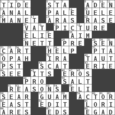 ACROSS 1. Periodic rise and fall of the sea level 5. R.R. building 8. An important port of Yemen 12. Of or related to the anus 13. Light colored 15. Ubangi River tributary 16. French painter Edouard 18. Caspian sea tributary 19. Raze (variant) 20. Large container 22. Photo 24. Writer Wiesel 26. Direct toward a target or goal 27. Remaining after all deductions 28. Before (prefix) 29. Elected rep. 32. Heavy open wagon 35. Aid 37. Parent Teacher Association (abbr.) 38. Brightly colored fish 39. Retirement account (abbr.) 40. Drawn tight 41. Pacific Standard Time (abbr.) 42. Scram! 43. One of the Great Lakes 44. Observe 45. ___ a Wonderful Life 46. Greek god of love 49. Adept person 50. Table seasoning 51. Thinks logically 55. Biblical high priest 56. Dry up 57. Island territory of the United States 59. Thespian 63. 90 degrees 64. Prepare for publication 65. Australian parrot (variant) 66. Ancient Greek god of war 67. Begley and Asner 68. Mild oath DOWN 1. Scottish cap 2. _ tizzy (2 wds.) 3. One of the 12 tribes of Israel 4. Veterans Day date 5. Health resort 6. Canvas cover 7. Mountain range southwest of Kyrgyzstan 8. Gold (Symbol: Au) 9. Letter starter 10. Otherwise 11. Born 14. Fortification 17. Lie 21. Teat (slang) 23. Make a knot 25. Principles of right and wrong 28. Food holders 29. Coast Guard woman 30. Needle holder 31. Nathan's nickname 32. 911 reaches them 33. Domed church section 34. Pace 36. Epoch 40. A testis 42. Moe Howard, for one 45. Big collection agency 47. Actress Charlotte 48. Rounded earthenware pot or jar 49. Actors' quests 51. Bring up, as a child 52. Relaxation 53. Unadorned 54. Stated 56. Ocean 58. Mountains (abbr.) 60. Coat; cloak 61. Mouth or opening 62. To free from