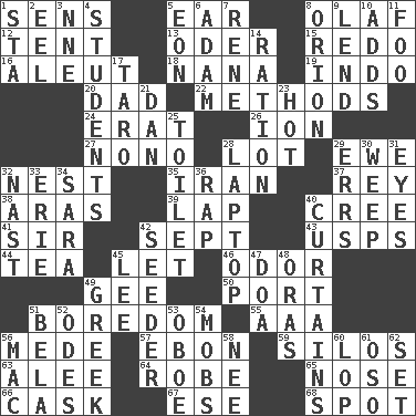 ACROSS 1. Elected reps. 5. Ewer handle 8. Norwegian king 12. Portable shelter 13. River in Europe 15. Make new 16. Native American of Southwest Alaska 18. Nanny 19. _ china 20. June honoree 22. Modes 24. Part of Q.E.F. 26. Electrically charged atom 27. Words to Nanette 28. Car dealer's back yard 29. She-sheep 32. Egg locale 35. SW Asia republic 37. Marina Del _, California 38. Caspian sea tributary 39. Pet locale 40. Algonquian 41. Title for a knight 42. Back-to-school mo. 43. United States Postal Service (abbr.) 44. Beverage made from leaves 45. Allow 46. Aroma 49. Unit of force equal to gravity 50. Sweet dark-red dessert wine 51. Mood resulting from idleness 55. American Automobile Association (abbr.) 56. Ancient Persian 57. Inky black, to poets 59. Grain storage towers 63. Toward shelter 64. Loose flowing garment 65. Sense of smell 66. Keg 67. Compass dir. 68. Blemish DOWN 1. R.R. building 2. Snakelike fish 3. Compass dir. 4. SAT takers 5. Period of immesurable duration 6. First man 7. French philosopher Descartes 8. Greek mythologigal hunter 9. Grant temporary use of 10. Sums up 11. Egg _ yung 14. Food allowance for one day 17. Edible starchy tuberous root 21. Daniel's nick name 23. Being at a high temperature 25. Bathroom 28. Portable computer 29. Blunders 30. Shed a tear 31. Sight organs 32. Political cartoonist Thomas 33. 4th largest of the Great Lakes 34. "Two Mules for Sister ____" 36. Strike 40. Window treatments 42. Sowing specialist 45. Area sheltered from the wind 47. ___ good deed 48. Mouths or openings 49. Hellenic 51. Actor Lugosi 52. Lyric poems 53. Mitch Miller's instrument 54. Crowds into 56. Big _ 58. Born 60. Trim (branches) 61. Bear (Spanish) 62. Put into a specified state