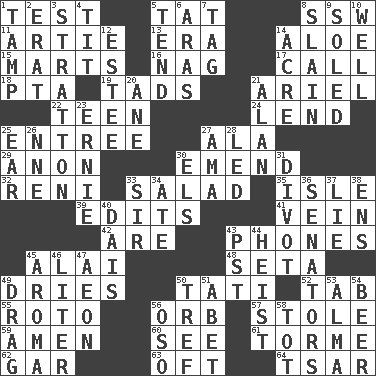 ACROSS 1. Trial 5. Make lace 8. Compass dir. 11. Nick name for Arthur 13. Period 14. _ vera 15. Shops 16. Tired old horse 17. Give a ring to 18. Parent Teacher Assoc. 19. Bits 21. Satellite of Uranus 22. Adolescent 24. Grant temporary use of 25. Main course 27. According to 29. Soon (poet.) 30. Make improvements or corrections to 32. Painter Guido (1575-1642) 33. Vegetable dish 35. Capri or Wight 39. Prepares for publication 41. Distinctive style or manner 42. "We ___ not amused" (Victoria) 43. Gives a jingle 45. Jai _ 48. Bristle 49. Frees from moisture 50. Jacques of French films 52. Keyboard key 55. Printing process, for short 56. Globe 57. Took without asking 59. So be it 60. Perceive with the eye 61. Singer Mel 62. Slender fish 63. Often (poetically) 64. Russian ruler of old DOWN 1. Pack (down) 2. Part of Q.E.F. 3. Ski resort town in Vermont 4. Teat (slang) 5. Be inclined (to) 6. Ancient river in northeast Turkey 7. Label 8. Killed 9. Having a sole or soles 10. Water source 12. First name in cosmetics 14. 43,560 square feet 20. One (Scot) 21. ____ Jay Lerner 23. Bert's buddy 25. Hearing organ 26. Compass dir. 27. Nursemaid (var.) 28. Directed 30. Raised railways 31. A piece of turf (Scot.) 33. Title for a knight 34. Had dinner 36. Elected representatives 37. Falsehood 38. Followers of ems 40. Raised platform 43. Pacific Standard Time (abbr.) 44. Robbery 45. Scent 46. 61 cubic inches 47. Age 49. To draw with force 50. Not kosher 51. Collude with 53. _ mater 54. Fermented drink made from hops 56. Bear (Spanish) 58. Small child