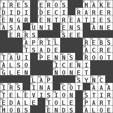 ACROSS 1. Angers 5. Greek god of love 9. Create 13. "You Light Up My Life" star Conn 14. Tenth: prefix 15. More uncommon 16. Engineer (abbr.) 17. Pleas 19. White ___ sheet 20. Corn or form start 21. Followers of ems 22. A saturated hydrocarbon 23. Blunders 25. Observe 26. Showery time 30. Confederate soldiers (slang) 34. Sadhe (variant) 35. 1/640 square mile 36. "Change" in Tahitian 39. Actor Sean's family 42. Carrot, for example 43. In addition 44. Ancient Celtic tribe of eastern Britain 46. Small, secluded valley 47. Music written for nine 48. Pet locale 51. Synchronize (abbr.) 54. Big collection agency 57. _ tizzy (2 wds.) 58. Small bed 60. Auto club (abbr.) 62. Household entertainment appliance 65. Tumult 66. Peak District village in England 67. Lacquered or enameled metalware 68. Component 69. Crowds into 70. Conclusions 71. _ vera DOWN 1. The main thing one is thinking about 2. Wash lightly 3. _ Allan Poe 4. Title for a knight 5. Genesis locale 6. Painter Guido (1575-1642) 7. Sep. follower 8. Founders of families 9. Floor protector 10. Operatic vocal solo 11. Peachy ____! 12. Celtic language 15. To erase 18. Compass dir. 20. United States Postal Service (abbr.) 24. Food allowance for one day 27. Hit sharply and swiftly 28. Binary compound 29. Soviet premier 1918-24 30. Noteworthy scarcity 31. Environmental prefix 32. Sis' sibling 33. Put into a specified state 36. Label 37. 100% 38. Purpose 40. Non-commissioned officer (abbr.) 41. Elected rep. 45. A home for chicks 48. Moving, as bait 49. Cuckoo 50. Thick mixture 52. Relating to or accompanying birth 53. Capital of Egypt 54. A distinct part 55. Redecorate 56. Thick slice 58. Chilled 59. Singles 61. Johnson of "Laugh-In" 63. Raised railways 64. Electrically charged atom 65. Health resort