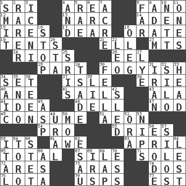 ACROSS 1. _ Lanka 4. Length times width 8. Papal veil 12. Big _ 13. Drug cop 14. Arabian gulf 15. Angers 17. Letter starter 18. Speak pompously 19. Portable shelters 21. Pipe bend 23. Mountains (abbr.) 24. Disturbances 26. Snakelike fish 28. Piece 30. Out of fashion; old fashioned 34. Put into a specified state 37. Capri or Wight 39. 4th largest of the Great Lakes 40. One (Scot) 41. Moves on water 43. According to 44. The content of cognition 46. Small valley 47. Lower and raise head in agreement 48. Ingest 51. Period of immesurable duration 54. Adept person 55. Frees from moisture 58. ___ a Wonderful Life 61. Deep reverence 63. Showery time 65. Add up to 67. Drop; flow; fall 71. Flatfish 72. Ancient Greek god of war 73. Ancient river in northeast Turkey 74. Two (Sp.) 75. Globular water bottle used in Asia 76. United States Postal Service (abbr.) 77. Eastern Standard Time (abbr.) DOWN 1. Stricken, poetically 2. More uncommon 3. Ancient Celtic tribe of eastern Britain 4. Also 5. Actress Charlotte 6. Period 7. Measure of real estate 8. Distant 9. First man 10. Remaining after all deductions 11. Washington bills 16. Close up, plug up 18. Cassini of fashion 20. R.R. building 22. Lion 25. Indian titles of respect 27. Potassium hydroxide 29. Sadhe (variant) 30. Chap (slang) 31. SW Asia republic 32. Grain storage tower 33. Froth on beer 34. Ketch in the Levant 35. Inside; within (prefix) 36. Adolescent 38. Untruth 42. Downhill vehicle 45. Viper 49. Mountain range 50. Cut the grass 52. Mouth or opening 53. Cuts off 56. Eat (away) 57. Grain storage towers 58. Slanted text style (abbr.) 59. "Corrida" creature 60. Proofreading order 62. Son of Isaac 64. For fear that 66. White ___ sheet 68. Big collection agency 69. Infant locale 70. Curvy letter
