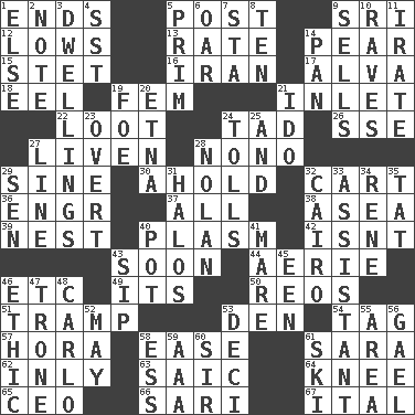 ACROSS 1. Extremities 5. Mail 9. Indian title of respect (Mr.) 12. Moos 13. Pace 14. Lightbulb-shaped fruit 15. Proofreading order 16. SW Asia republic 17. Inventor's middle name 18. Snakelike fish 19. Opposite of masc. 21. An arm off of a larger body of water 22. Spoils 24. Small boy 26. Compass dir. 27. Make or become more lively 28. Words to Nanette 29. Trig term 30. Hold, grip (Informal) 32. Haul 36. Engineer (abbr.) 37. Everything 38. At sea 39. A home for chicks 40. Suffix with ecto or cyto 42. Is not 43. Within a short period 44. Nest on high 46. And so on (abbr.) 49. It is 50. Vintage cars 51. _____ steamer (cargo ship) 53. Lair 54. Label 57. Israeli folk dance 58. Relaxation 61. "Two Mules for Sister ____" 62. Inwardly 63. Ketch in the Levant 64. Leg joint 65. Corporate head (abbr.) 66. Indian skirt 67. Slanted text style (abbr.) DOWN 1. Otherwise 2. Make mention of 3. Homes 4. Fast jet (abbr.) 5. Demure 6. Rowing implement 7. R.R. building 8. "___ Little Indians" 9. Exchanges for money 10. All-night dance parties 11. Feeling or showing extreme anger 14. Baking dish 19. Enemy 20. Inactive volcano in Sicily 21. Wedding promise 23. Unconcealed 24. For Whom the Bell _____ 25. Also 27. Actor's bit 28. Pitcher Ryan 29. Elected rep. 31. Auras 32. Capital of Egypt 33. Aide 34. French philosopher Descartes 35. Make lace 40. Cooking vessel 41. Female horse 43. Small drink 45. Car or cant ending 46. Principle of right and wrong 47. Heavy duty weighing machine 48. Monte _, Las Vegas Hotel/Casino 52. Can I? 53. Tenth: prefix 55. Type of rug 56. Highlander 58. Double-curved letter 59. American Automobile Association (abbr.) 60. Title for a knight 61. What Jean-Claude Killy likes to do