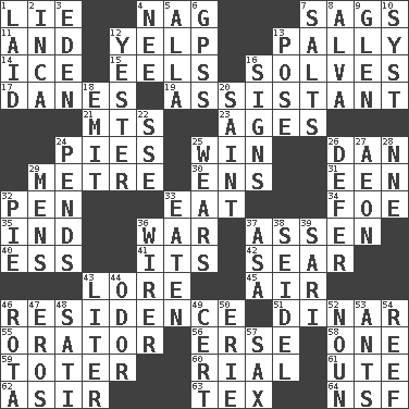 ACROSS 1. Untruth 4. Tired old horse 7. Droops 11. Plus 12. Sharp bark 13. Chummy 14. Frozen water 15. Snakelike fish 16. Finds the solution 17. Natives or inhabitants of Denmark 19. Helper 21. Mountains (abbr.) 23. Matures 24. Sliced desserts 25. Victory 26. Daniel's nick name 29. Distance measurement (Brit.) 30. Followers of ems 31. Car or cant ending 32. Fenced enclosure 33. Consume 34. Enemy 35. Working for oneself (abbr.) 36. Armed conflict 37. NE Netherlands city 40. Double-curved letter 41. It is 42. Dry up 43. Old wives' tales, e.g. 45. Atmosphere 46. Dwelling 51. Middle Eastern gold or silver currency 55. Speaker 56. Celtic language 58. Single 59. Carrier 60. Monetary unit of Yemen 61. Shoshoni 62. SW Saudi Arabia district 63. John Ritter's dad 64. Overdraft (abbr.) DOWN 1. Put down 2. South American Indian 3. Locale of original sin 4. Born 5. Silent film actress Nazimova 6. Global Positioning Systems (abbr.) 7. Table seasonings 8. Inventor's middle name 9. Small, secluded valley 10. System (abbr.) 12. Last past 13. Airs 16. Public displays of written messages 18. Send forth 20. Virtuous person 22. Compass dir. 24. Depends 25. Puts on (as clothing) 26. Put off 27. Age 28. Compass dir. 29. Not women's 32. Sliced dessert 33. Consumed 36. One who wires 37. White ___ sheet 38. A glass for beer 39. Indian skirt 43. 61 cubic inches 44. Aroma 46. Round or rotation of duties 47. Greek god of love 48. Suttee (variant) 49. Certainty 50. 4th largest of the Great Lakes 52. Part of speech 53. Pismires 54. Coral collection 57. Saxophone
