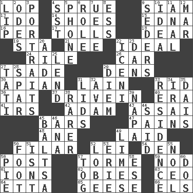 ACROSS 1. Chop off 4. Disorder 9. Thailand, formerly 13. Wedding promise 14. Imelda's hoard 15. Pulitzer Prize-winning author Ferber 16. For each 17. For Whom the Bell _____ 18. Letter starter 19. R.R. building 21. Born 22. Standard of perfection 24. Cause heat under the collar 26. Auto 27. Sadhe (variant) 29. Hiding places for outlaws 30. Bee-related 31. (Had) reclined 33. To free from 36. Make lace 37. Popular '50s hangout 40. Period 41. Big collection agency 42. First man 43. Slender Brazilian palm 45. Oblong pieces of solid material 47. Aches 48. A saturated hydrocarbon 49. Put down 50. Of or pertaining to a thread or threads 52. Flowery wreath 54. Lair 56. Mail 57. Singer Mel 59. Dreamland 61. Charged atoms 62. Off-Broadway awards 63. Corporate head (abbr.) 64. Singer James 65. Honkers 66. Raised railways DOWN 1. Mouth edge 2. Lyric poems 3. Likenesses of persons 4. Fast jet (abbr.) 5. Give a jingle 6. Hero or heavy, e.g. 7. Ubangi River tributary 8. Curvy letter 9. Spring feasts 10. The main thing one is thinking about 11. Of or related to the anus 12. Make imperfect 20. Opera by Verdi 22. Ancient Celtic tribe of eastern Britain 23. Daniel's nick name 25. Grant temporary use of 27. Jacques of French films 28. Practice fight 29. South Vietnam president (1954) 31. Flaplike coverings 32. Actress Gardner 33. Home 34. SW Asia republic 35. Raised platform 38. Less widely known 39. California wine valley 44. Stated 45. Greek mezzo-soprano Agnes 46. Santa ___, CA 49. Citrus fruits 50. Pick up the tab 51. Is not 52. Ear part 53. 4th largest of the Great Lakes 55. Christmas carol 56. Sliced dessert 57. Coat; cloak 58. Compass dir. 60. Two (Sp.)