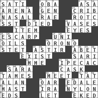 ACROSS 1. Suttee (variant) 5. Chief or king in Benin or Nigeria 8. White ___ sheet 11. Sports stadium 13. Commissioned mil. rank 14. Baby bed with high sides 15. Rhinal 16. Actress Charlotte 17. College mil. group 18. Fast jet (abbr.) 19. Passed on 21. Flower holders 22. A whole individual unit 24. Sight organs 25. Fortification 27. Corn or form start 29. Lubricates 30. U. of Maine site 32. Proofreading order 33. Moving or stirring 35. Collude with 39. Have an existence 41. Indian skirt 42. Madame (abbr.) 43. Medicinal drug used to evoke vomiting 45. "Two Mules for Sister ____" 48. Keg 49. Corrects by punishment or discipline 50. Rendezvous 52. Make lace 55. Actor Alda or Thicke 56. Boat paddle 57. Peak District village in England 59. Vertical spar for supporting sails 60. Lyricist Gershwin 61. High-strength synthetic material 62. Begley and Asner 63. Allow 64. Made supply last DOWN 1. Without 2. Caspian sea tributary 3. One of the two male reproductive glands 4. _ tizzy (2 wds.) 5. Legendary monster 6. Necklace unit 7. One (Scot) 8. Came up 9. Locates 10. Lettered men learn these first 12. Tree or shrub in the Birch family 14. Supercomputer manufacturer 20. Naughty child 21. Distinctive style or manner 23. Clothes sense 25. Greek goddess of the dawn 26. Be seated 27. RI univ. 28. Or not 30. Baseball player Mel 31. Fertile tracts in a desert 33. Direct toward a target or goal 34. Compass dir. 36. Sass 37. Period 38. Nervous spasm 40. Dec. holiday 43. Frozen water 44. Eucharist need 45. First course 46. Collect or gather 47. Monthly bill 49. Docile 50. Female horse 51. Part of Q.E.F. 53. _ vera 54. Look after 56. Petroleum 58. Color