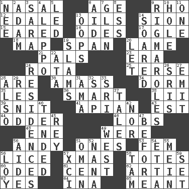 ACROSS 1. Rhinal 6. Grow older 9. 17th letter of the Greek alphabet 12. Peak District village in England 13. Lubricates 14. The Jewish people; Israel 15. Having ears or earlike features 16. Lyric poems 17. Stare at amorously 18. Atlas unit 19. Connect, as a bridge 20. Unable to walk 21. Friends 23. Epoch 24. Roll call or roster of names 25. Laconic 28. "We ___ not amused" (Victoria) 30. Collect or gather 34. Dormintory (informal) 35. French article 36. Don Adams' spy role 38. Cards in a Roman deck? 39. In a ____ (agitated or irritated) 41. Bee-related 43. Eastern Standard Time (abbr.) 44. More peculiar 46. Tennis shots 48. Compass dir. 49. We are 50. Actor Griffith 51. Washington bills 53. Opposite of masc. 56. Louse (plural) 57. Dec. holiday 58. Lugs 60. Wrote a lyric poem 61. Penny 62. Nick name for Arthur 63. Affirmative reply 64. _ tizzy (2 wds.) 65. Intended DOWN 1. Born 2. First man 3. "Two Mules for Sister ____" 4. City in Syria 5. Directed 6. Opera by Verdi 7. Small, secluded valley 8. Double-curved letter 9. Frustrating wastes of time 10. Hollow 11. Single 13. I made a mistake 14. Flew 19. Criticizes harshly 20. Allow 22. "One Day ___ Time" 24. Dwellings 26. Indian titles of respect 27. Send forth 28. In addition 29. Tear apart 31. Wet nurse (var.) 32. Plant excrement 33. _ Lanka 37. Stories 40. Watched over 42. Or not 45. Marina Del _, California 47. Prior to 49. 270 degrees 50. Assistant 51. Sign of things to come 52. Nanny 54. Singer James 55. Chow _ 56. Myrna of the movies 57. One more than ninety 58. Scottish cap 59. Put into a specified state