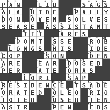 ACROSS 1. Baking dish 4. Flaplike covering 7. Droops 11. Insect wing 12. Flintstone garb 13. Friendly 14. Spanish title 15. Baking chamber 16. Finds the solution 17. Gospel singer Marvin 19. Helper 21. One more than two 23. Ancient Greek god of war 24. Do not 25. Compass dir. 26. Director Reiner 29. Yearns 30. Part of HMS, perhaps 31. Binary compound 32. Police officer (slang) 33. Male child 34. Lair 35. "We ___ not amused" (Victoria) 36. Ewer handle 37. Administered medicine 40. For each 41. Had dinner 42. Mouths or openings 43. Australian parrot (variant) 45. Plant excrement 46. Home 51. Sadhe (variant) 55. Spoke pompously 56. Butter sub 58. River (Sp.) 59. Carrier 60. One who makes use of a thing 61. "___ Little Indians" 62. SW Saudi Arabia district 63. Writing instrument 64. Begley and Asner DOWN 1. Writing tablets 2. _ vera 3. Nanny 4. 54 in ancient Rome 5. The content of cognition 6. Habitations of wild animals 7. Table seasonings 8. Inventor's middle name 9. Small, secluded valley 10. System (abbr.) 12. Weeding 13. Introduce or present, as a question 16. Titles for men of rank and authority 18. The Jewish people; Israel 20. Indian antelope 22. It is 24. Drug addict 25. Dinah or Pauly 26. Amusement-park features 27. Wrote a lyric poem 28. Benjamin's nick name 29. Old wives' tales, e.g. 32. Head covering 33. Smooth fabric 36. Having ears or earlike features 37. Two (Sp.) 38. Speaker 39. Plant excrements 43. 61 cubic inches 44. Baltic tributary 46. Roll call or roster of names 47. Greek god of love 48. Suttee (variant) 49. Clever action or accomplishment 50. Otherwise 52. Johnson of "Laugh-In" 53. Passed on 54. Immeasurably long periods of time 57. Car or cant ending