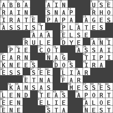 ACROSS 1. Swedish rock group 5. The 18th letter of the Arabic alphabet 8. Purpose 11. Precipitation 12. Fastener 14. 17th letter of the Greek alphabet 15. Feeling or showing extreme anger 17. Dad 18. Grows older 19. Help 21. Food holders 23. Auto club (abbr.) 25. Otherwise 26. Court order 27. Color 28. Cuckoo 31. Sliced dessert 33. Small bed 35. Slender Brazilian palm 37. Merit 38. Tired old horse 40. Native american tent (variation) 41. Leg joints 43. Two (Sp.) 45. Lyricist Gershwin 46. Double-curved letter 47. Observe 50. One who doesn't tell the truth 52. Inactive volcano in Sicily 53. At a great distance 54. Sunflower state 56. Makes clutter 61. Grant temporary use of 62. Beverages made from leaves 65. To the left, to Queeg 66. Car or cant ending 67. Writer Wiesel 68. _ vera 69. Compass dir. 70. R.R. building 71. Egg locale DOWN 1. Operatic vocal solo 2. Long, evenly shaped pieces 3. Prejudice 4. Against 5. Viper 6. _ tizzy (2 wds.) 7. Slept 8. Goad 9. "______ My Girl" (Turtles hit) 10. Greek goddess of the dawn 13. Chummy 16. Son of Isaac 18. Had dinner 20. Baby powder 22. At sea 24. A really long time 26. French philosopher Descartes 28. SW Saudi Arabia district 29. California wine valley 30. One more than two 31. Zero-star reviews 32. Angers 34. Bit 36. Use a swizzle stick 37. Make supply last 39. _ course 42. Fast planes 44. Thailand, formerly 48. Related on the mother's side 49. Artist's stands 51. Length times width 52. Conclusion 54. Peachy ____! 55. Singer Murray 57. Connect, as a bridge 58. Flatfish 59. Greek god of love 60. Proofreading order 61. Area sheltered from the wind 63. Small island 64. Ocean