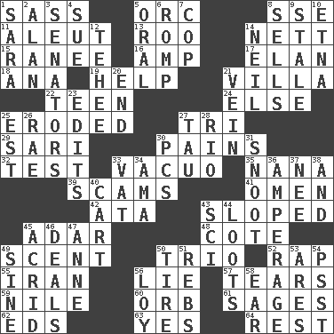 ACROSS 1. Backtalk 5. The grampus (Milton) 8. Compass dir. 11. Native American of Southwest Alaska 13. Friend of Pooh 14. Remaining after all deductions 15. The wife of a rajah (variant) 16. Electrical Unit 17. Style 18. Santa ___, CA 19. Assist 21. Country residence 22. Adolescent 24. Otherwise 25. Eaten away 27. Three (prefix) 29. Indian skirt 30. Aches 32. Trial 33. In a vacuum (with "in") 35. Grandmother 39. Fraudulent business schemes 41. Sign of things to come 42. _ moment's notice (2 wds.) 43. Inclined 45. The sixth month of the Jewish calendar 48. ____ d'Azur (French Riviera) 49. Aroma 50. Musical group of three 52. Reproach for some lapse or misdeed 55. SW Asia republic 56. Untruth 57. Lacerates 59. Mediterranean tributary 60. Globe 61. Gurus 62. Begley and Asner 63. It is so 64. State of inaction DOWN 1. "Two Mules for Sister ____" 2. ____ Jay Lerner 3. Elected representatives 4. Institute legal proceedings 5. Of the mouth 6. Play 7. Police officer (slang) 8. Exchanges for money 9. Showing deterioration from age 10. Inactive volcano in Sicily 12. Giggle 14. Famous astronaut Armstrong 20. Conclusion 21. Distinctive style or manner 23. Proofreads 25. Eastern Standard Time (abbr.) 26. Actress Charlotte 27. The 19th letter of the Greek alphabet 28. River (Sp.) 30. Personal Computers (abbr.) 31. Snob 33. Large container 34. Housemaid (var.) 36. Electrical Measurement 37. Born 38. Also 40. Heavy open wagon 43. _-fi 44. Plunders 45. Bitter 46. Allots cards 47. Singer Murray 49. Trig term 50. Become fatigued 51. Confederate soldiers (slang) 53. Ancient Greek god of war 54. Inconspicuous attention getter 56. Myrna of the movies 58. Ewer handle