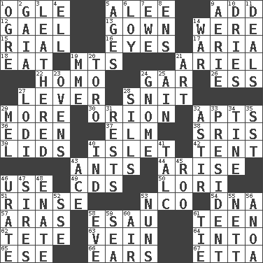 ACROSS 1. Stare at amorously 5. Toward shelter 9. Find the sum of 12. Highlander 13. Woman's formal wear 14. Past tense of be (plural) 15. Monetary unit of Yemen 16. Sight organs 17. Roberta Peters solo 18. Consume 19. Mountains (abbr.) 21. Satellite of Uranus 22. Like (prefix) 24. Slender fish 26. Double-curved letter 27. Crowbar 28. In a ____ (agitated or irritated) 29. Greater amount 30. Greek mythologigal hunter 32. Flats, for short 36. Paradise 37. Shade tree 38. Indian titles of respect 39. Hats (slang) 40. Small island 42. Portable shelter 43. Pismires 44. Ascend 46. Purpose 49. Music discs 50. Australian parrot (variant) 51. Wash lightly 53. Non-commissioned officer (abbr.) 54. Heredity factor (abbr.) 57. Caspian sea tributary 58. Son of Isaac 61. Adolescent 62. Wig 63. Distinctive style or manner 64. To the inside or interior of 65. Compass dir. 66. Hearing organs 67. Singer James DOWN 1. Legendary monster 2. Greek goddess of the earth (variant) 3. Tough but pliablecoriaceous 4. Pipe bend 5. Ripens 6. Myrna of the movies 7. She-sheep 8. Followers of ems 9. Nest on high 10. Frees from moisture 11. Allots cards 14. Armed conflict 19. Madame (abbr.) 20. "Corrida" creature 21. Nonscientific branch of learning 23. Baking chambers 24. Dwarf 25. The 18th letter of the Arabic alphabet 27. Farming town in central California 28. Beverly of Met fame 29. Cartoonist voice _ Blanc 31. Musical pauses 32. Moving about 33. Elected leader of a country 34. Prong on a fork 35. Fast jet (abbr.) 40. Working for oneself (abbr.) 41. Baby powder 43. Adept person 45. Friend of Pooh 46. A salt of uric acid 47. Fathers 48. Maternal 52. Compass dir. 53. Religious women 55. Remaining after all deductions 56. Small Philippine buffalo 58. Night before a holiday 59. Ocean 60. Wind 61. Make a knot
