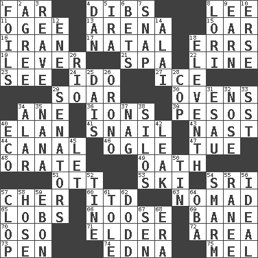 ACROSS 1. At a great distance 4. Claim 8. Area sheltered from the wind 11. Double curve, resembling the letter S 13. Sports stadium 15. Boat paddle 16. SW Asia republic 17. Brizilian seaport 18. Blunders 19. Crowbar 21. Health resort 22. Actor's bit 23. Observe 24. Wedding promise 27. Frozen water 29. Fly high 30. Baking chambers 34. One (Scot) 36. Charged particles 39. Mexican monetary units 40. Style 41. Slow-paced one 43. Political cartoonist Thomas 44. Lessep's creation 46. Stare at amorously 47. Third day of the wk. 48. Declaim 49. Pledge 51. Baseball player Mel 53. What Jean-Claude Killy likes to do 54. Indian title of respect (Mr.) 57. "Mermaids" star 60. It would 63. Roamer 65. Tennis shots 66. Trap for birds or small mammals 69. Object of repulsion 70. Bear (Spanish) 71. A person who is older than you are 72. Length times width 73. Animal enclosure 74. Pulitzer Prize-winning author Ferber 75. Cartoonist voice _ Blanc DOWN 1. Fencing necessities 2. Match 3. Rob, plunder, or pillage 4. Daniel's nick name 5. Lyricist Gershwin 6. Wagers 7. Fastener 8. Australian parrot (variant) 9. Merit 10. Celtic language 12. Compass dir. 14. Jai _ 18. Veterans Day date 20. _ de Janeiro 25. Raised platform 26. U. of Maine site 28. Police officer (slang) 29. Elected representatives 31. Son of Isaac 32. Olfactory organ 33. Fast jet (abbr.) 34. Having or resembling wings 35. Grandmother 37. Tired old horse 38. Grain storage towers 40. Environmental prefix 42. Path through which fluid escapes 45. Allow 50. Metal container 52. Prong on a fork 54. Excessive but superficial compliments 55. Indian princess (variant) 56. Standard of perfection 57. Hoof sound 58. Stockings 59. Inky black, to poets 61. Lacquered or enameled metalware 62. Texas town _ City 64. Chief or king in Benin or Nigeria 67. Elected rep. 68. Epoch
