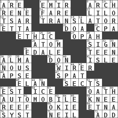 ACROSS 1. "We ___ not amused" (Victoria) 4. Independent ruler or chieftain 8. Bowlike part 12. French philosopher Descartes 14. Conductor's collection 15. _ and Stitch 16. Russian ruler of old 17. Interpreter 20. Singer James 21. ___ good deed 22. Numbers guy (abbr.) 23. Value system 27. Brightly colored fish 29. Smallest unit of an element 31. Public display of a written message 34. Peak District village in England 35. Adolescent 36. _ mater 39. Spanish title 41. Small island 42. Horse sense 43. One who wires 46. Domed church section 47. Argument over a trivial matter 48. Liveliness 51. Religious groups 54. Eastern Standard Time (abbr.) 56. Frozen water 58. Pledge 61. Form of transportation 66. Leg joint 67. Coral ridge 68. Migrant worker of the '30s 69. Inactive volcano in Sicily 70. System (abbr.) 71. Famous astronaut Armstrong 72. Say or write further DOWN 1. Johnson of "Laugh-In" 2. Take ten 3. Related on the mother's side 4. Bank Draft (abbr.) 5. Third mo. 6. Retirement account (abbr.) 7. Tear apart 8. Wing 9. Actors Guy, Robert Welles, and Clint 10. Hoof sound 11. Israeli folk dance 13. Part of Q.E.F. 18. "Barney Miller" actor Jack 19. Infant locale 24. Possessed 25. Call ___ day 26. Lacking warmth 28. Moving about 30. Catcalls? 32. Set 33. Compass dir. 34. Artist's stand 36. Santa ___, CA 37. Trim (branches) 38. French bagpipes 40. Cuts off 44. Actress Charlotte 45. And so on (abbr.) 49. Direct toward a target or goal 50. Non-commissioned officer (abbr.) 52. Puff or smoke 53. Before Barbara or Clara 54. Hearing organs 55. Chop _ 57. Inky black, to poets 59. Watch over 60. Froth on beer 62. Often (poetically) 63. D.D.E's nickname 64. Cards in a Roman deck? 65. Snakelike fish
