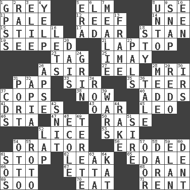 ACROSS 1. Jennifer or Joel 5. Shade tree 8. Purpose 11. Diluted with white 12. Coral collection 14. Compass dir. 15. Not moving 17. The sixth month of the Jewish calendar 18. Comedian Laurel of Laurel & Hardy 19. Oozed 21. Portable computer 23. Label 25. "If ____ say so..." 26. SW Saudi Arabia district 27. Snakelike fish 28. Medical imaging device (abbr.) 31. Infant food 33. Title for a knight 35. Navigate 37. 911 reaches them 38. At this time 40. Does sums 41. Frees from moisture 43. Boat paddle 45. Lion 46. R.R. building 47. Fish or hair follower 50. Raze (variant) 52. Louse (plural) 53. What Jean-Claude Killy likes to do 54. Speaker 56. Eaten away 61. Constrict 62. Path through which fluid escapes 65. Peak District village in England 66. Baseball player Mel 67. Singer James 68. Northwest Algerian city 69. "Barney Miller" actor Jack 70. Consume 71. Monthly bill DOWN 1. Global Positioning Systems (abbr.) 2. Pace 3. Writer Wiesel 4. Sharp bark 5. Period 6. Directed 7. Ear of corn 8. To (old English) 9. Fastener 10. Car or cant ending 13. Movie unit 16. Allows 18. Filthy place 20. Raised platform 22. Friends 24. Broad smile 26. Domed church section 28. Ancient Persian 29. Do over again 30. Big collection agency 31. Left side of a ship or aircraft 32. Capital of Western Samoa 34. Friend of Pooh 36. Story 37. Music discs 39. Armed conflicts 42. In a ____ (agitated or irritated) 44. Immoral or dissolute person 48. Learning spot: Fr. 49. Cigar-shaped 51. Beget 52. Infant locale 54. Von Bismarck 55. Printing process, for short 57. Scent 58. Have the gumption 59. Style 60. Scratch 61. Mayday 63. "One Day ___ Time" 64. Krazy ___ of comics
