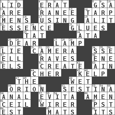 ACROSS 1. Flaplike covering 4. Part of Q.E.F. 8. Girls' org. (abbr.) 11. "We ___ not amused" (Victoria) 12. Indian princess (variant) 14. Canvas cover 15. Not women's 17. Putting into practice 18. Set down 19. Gist 21. Cements 23. Make lace 24. _ moment's notice (2 wds.) 25. Letter starter 27. Desk light 30. Untruth 31. Device for capturing images 34. Compass dir. 37. Pipe bend 38. All-night dance parties 39. Compass dir. 40. Raised railways 41. Cause to be 43. The 18th letter of the Arabic alphabet 44. "Mermaids" star 45. Seaweed 47. Definite Article 49. Dripping 50. Greek mythologigal hunter 52. French poetic form 56. Of or related to the anus 57. Webber/Rice musical 60. So be it 61. To provide with a ceiling 62. One who wires 63. Pacific Standard Time (abbr.) 64. Eastern Standard Time (abbr.) 65. Floor protectors 66. It is DOWN 1. Unable to walk 2. Angers 3. Lairs 4. Spew [out] 5. Raze (variant) 6. Black tropical American cuckoo 7. Nine, plus one 8. An organ shaped like a helmet 9. Indian titles of respect 10. Fitting 13. Oval reproductive body of a fowl 14. Pulled tight 16. Bristle 20. Drug cop 22. Pet locale 25. Deli pickle 26. Snakelike fish 27. Crowbar 28. Length times width 29. Vertical spar for supporting sails 30. Area sheltered from the wind 32. Bowlike part 33. Female horse 34. Lick closed 35. Clip 36. Car or cant ending 42. Supplements with great effort 44. Corporate head (abbr.) 46. Singer James 47. Distinguishing feature 48. Land elevation 49. Puts on (as clothing) 50. Singles 51. ___ Haven, CT 52. Proofreading order 53. Body of Kaffir warriors 54. Egg locale 55. Pismires 56. Adept person 58. Zeal 59. Retirement account (abbr.)