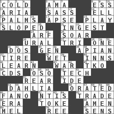 ACROSS 1. Having a low temperature 5. Nursemaid (var.) 8. Curvy letter 11. Roberta Peters solo 12. Backtalk 14. Pipe bend 15. Insides of hands 17. Domed church section 18. Frolic 19. Had an oblique or slanted direction 21. Swallow 23. Sandy's bark 25. Fly high 26. Mountain range 27. Three (prefix) 28. Single 31. Two (Sp.) 33. Commissioned mil. rank 35. Bee-related 37. Hoop that covers a wheel 38. Dripping 40. Lodging establishments 41. Memorize 43. Armed conflict 45. Ring climax 46. Music discs 47. Bear (Spanish) 50. Technical 52. Located in or toward the back 53. Binary compound 54. Mexican or Central American flower 56. Spoke pompously 61. Papal veil 62. Nuclear Threat Initiatives 65. Exchange 66. Epoch 67. Puff or smoke 68. So be it 69. Cartoonist voice _ Blanc 70. To sift 71. Elected reps. DOWN 1. Smile enhancers 2. Relating to the mouth 3. _ and Stitch 4. Moist 5. White ___ sheet 6. Atlas unit 7. Aid 8. Snakelike fish 9. Narrow board 10. Playfully artful 13. Sir (Sp.) 16. Scorch 18. For each 20. To trail on the ground 22. Greek goddess of the earth (variant) 24. Soared 26. One who uses or employs something 28. Pig sound 29. Billionth: prefix 30. Followers of ems 31. Passed on 32. Mouths or openings 34. ___ Haven, CT 36. Essential or central part 37. Affectionate concern, for short 39. Jacques of French films 42. Christmas carol 44. Redecorate 48. Virtuous person 49. Speaker 51. Sure thing 52. 17th letter of the Greek alphabet 54. Have the gumption 55. Of or related to the anus 57. Ancient river in northeast Turkey 58. Not wild 59. Paradise 60. Lairs 61. Opposite of masc. 63. Mamie's mate 64. Observe