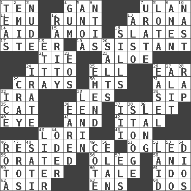ACROSS 1. "___ Little Indians" 4. Separate the seeds from cotton 7. ____ Bator, Mongolia 11. Australian flightless bird 12. Undersized animal 13. Odor 14. Help 15. Mine, in Marseilles 16. Chalkboards 17. Guide 19. Aide 21. Make a knot 23. _ vera 24. "Tell ____ the Marines!" 25. Pipe bend 26. Hearing organ 29. Trading vessels 30. Mountains (abbr.) 31. In the manner of 32. Lyricist Gershwin 33. French article 34. Small drink 35. Domesticated feline 36. Car or cant ending 37. Small island 40. Sight organ 41. Added to 42. Slanted text style (abbr.) 43. Australian parrot (variant) 45. Electrically charged atom 46. Dwelling 51. Stared at amorously 55. Spoke pompously 56. Cassini of fashion 58. Cuckoo 59. Carrier 60. Falsehood 61. Wedding promise 62. SW Saudi Arabia district 63. Followers of ems 64. Two (Sp.) DOWN 1. Beverages made from leaves 2. Give off 3. Naked 4. Chewing product 5. Small Philippine buffalo 6. Nuclear Threat Initiatives 7. A salt of uric acid 8. Globular water bottle used in Asia 9. So be it 10. Political cartoonist Thomas 12. Noteworthy scarcity 13. In addition 16. Beverly of Met fame 18. Singer James 20. Table seasonings 22. Greek goddess of the dawn 24. Feeling or showing extreme anger 25. Make improvements or corrections to 26. Artist's stand 27. Set down 28. Hit sharply and swiftly 29. Supercomputer manufacturer 32. Frozen water 33. Soviet premier 1918-24 36. Having ears or earlike features 37. One more than two 38. Moe Howard, for one 39. Long (Scottish) 43. 61 cubic inches 44. River in Europe 46. Round or rotation of duties 47. Greek god of love 48. Suttee (variant) 49. ____ d'Azur (French Riviera) 50. Enthusiasm 52. Put down 53. Inside; within (prefix) 54. "Vaya con ____" 57. Raised railways