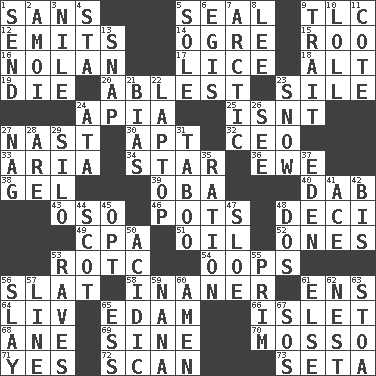 ACROSS 1. Without 5. Lick closed 9. Affectionate concern, for short 12. Sends forth 14. Legendary monster 15. Friend of Pooh 16. Pitcher Ryan 17. Louse (plural) 18. Keyboard modifier key 19. Pass on 20. Most capable 23. Filth; sediment 24. Capital of Western Samoa 25. Is not 27. Political cartoonist Thomas 30. Fitting 32. Corporate head (abbr.) 33. Roberta Peters solo 34. Play the lead 36. She-sheep 38. Set 39. Chief or king in Benin or Nigeria 40. Apply (a substance) by light strokes 43. Bear (Spanish) 46. Cooking vessels 48. Tenth: prefix 49. Numbers guy (abbr.) 51. Petroleum 52. Washington bills 53. College mil. group 54. I made a mistake 56. Narrow board 58. Sillier 61. Followers of ems 64. 54 in ancient Rome 65. Dutch treat 66. Small island 68. One (Scot) 69. Trig term 70. With motion or animation 71. Affirmative reply 72. Examine hastily 73. Stalk of a moss capsule DOWN 1. Post 2. Mine, in Marseilles 3. The longest river in the world 4. R.R. building 5. Not divided or shared with others 6. The front part of a cuirass 7. Northern region 8. Area sheltered from the wind 9. Distinguishing feature 10. Hang loosely or laxly 11. ____ d'Azur (French Riviera) 13. Fastener 21. Prejudice 22. Portable computer 23. Overwhelm 24. "One Day ___ Time" 26. Perceive with the eye 27. Tired old horse 28. "We ___ not amused" (Victoria) 29. Grain storage tower 31. Off limits 35. Food allowance for one day 37. Locale of original sin 41. Adept person 42. Altar cloth linen 44. Native of Scotland 45. Elect 47. _ gin 48. Two (Sp.) 50. Being or containing an acid 53. All-night dance parties 55. Demure 56. Kill 57. Actor's bit 59. Grandmother 60. So be it 61. Otherwise 62. A home for chicks 63. Portico 65. Curvy letter 67. Mayday