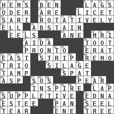 ACROSS 1. Cloth borders 5. Benjamin's nick name 8. Fails to keep up a pace 12. River in Europe 13. "We ___ not amused" (Victoria) 14. It is permitted: Lat. 15. Indian skirt 16. Happening in regular succession 19. Pipe bend 20. Refrain by choice 21. Snakelike fish 23. A saturated hydrocarbon 24. Medical imaging device (abbr.) 27. Opera by Verdi 30. A blast of a horn 31. Right away 34. Part of Q.E.F. 35. 90 degrees 38. Remove all contents or possession from 40. San ____ (Riviera town) 41. Musical group of three 42. Fodder prepared in a silo 44. Pack (down) 45. Argument over a trivial matter 46. Viper 47. Mayday 50. Lightbulb-shaped fruit 53. Stimulate to action 57. Pet locale 59. Supplementary 63. Pulitzer Prize-winning author Ferber 64. First name in cosmetics 65. Baking dish 66. Sew up the eyelids of hawks and falcons 67. Pull apart 68. Compass dir. 69. Relationship diagram DOWN 1. Stockings 2. Peak District village in England 3. Haggard of country music 4. Indian title of respect (Mr.) 5. Sharp remark 6. Greek god of love 7. Remaining after all deductions 8. 54 in ancient Rome 9. Adept person 10. Set 11. Filthy place 14. Actor's bit 17. American Automobile Association (abbr.) 18. Metal container 20. SW Saudi Arabia district 22. Portable computer 24. Greater amount 25. Wander 26. "Tell ____ the Marines!" 28. Two (Sp.) 29. Pismires 30. Cigar-shaped 32. Three (prefix) 33. Lubricates 35. Singer James 36. Ancient river in northeast Turkey 37. Simple or foolish person 39. Infant food 43. Stare wonderingly 47. Drop; flow; fall 48. Single 49. Fast jet (abbr.) 51. Tree or shrub in the Birch family 52. Indian princess (variant) 54. Corncob 55. "Terrible" tsar 56. French philosopher Descartes 58. Diluted with white 59. Put into a specified state 60. Purpose 61. Parent Teacher Association (abbr.) 62. For each 63. Eastern Standard Time (abbr.)