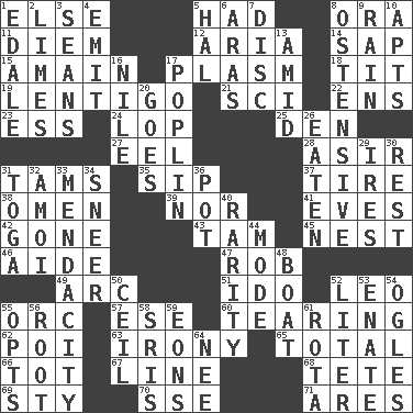 ACROSS 1. Otherwise 5. Possessed 8. Mouth or opening 11. South Vietnam president (1954) 12. Roberta Peters solo 14. Plant excrement 15. At full speed 17. Suffix with ecto or cyto 18. Teat (slang) 19. Small, flat, pigmented spot on the skin 21. _-fi 22. Followers of ems 23. Curvy letter 24. Trim (branches) 25. Lair 27. Snakelike fish 28. SW Saudi Arabia district 31. Scottish caps 35. Small drink 37. Hoop that covers a wheel 38. Sign of things to come 39. Not either 41. Nights before holidays 42. Went 43. Scottish cap 45. A home for chicks 46. Helper 47. Director Reiner 49. Curve 51. Wedding promise 52. Lion 55. The grampus (Milton) 57. Compass dir. 60. Lacerating 62. Luau course 63. Literary sarcasm 65. "_____ Recall" 66. Small child 67. Actor's bit 68. Wig 69. Filthy place 70. Compass dir. 71. Ancient Greek god of war DOWN 1. Peak District village in England 2. Citrus fruits 3. Actors Connery and Penn 4. Give off 5. Actor Linden 6. Ancient river in northeast Turkey 7. Flat circle 8. Clearly or manifestly demonstrative 9. Water falling in drops from the sky 10. Flats, for short 13. Among 16. "Death on the ____" 17. Cotton for raincoats, e.g. 20. Leaves 26. Ingested 29. Angers 30. Remainder 31. Ancient Roman robe 32. Mine, in Marseilles 33. Ananias' fault 34. Scornful expression 36. Cooking vessel 40. Noteworthy scarcity 44. Method 48. Water vessel 50. To provide with a ceiling 52. 61 cubic inches 53. Related on the mother's side 54. Stares at amorously 55. Chooses 56. Carrot, for example 58. Indian titles of respect 59. Immeasurably long periods of time 61. Round or rotation of duties 64. Born