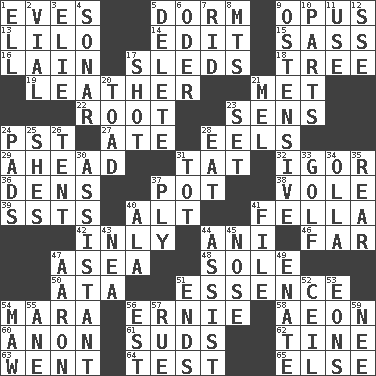 ACROSS 1. Nights before holidays 5. Dormintory (informal) 9. Musical composition 13. _ and Stitch 14. Prepare for publication 15. Backtalk 16. (Had) reclined 17. Bobsleighs 18. Relationship diagram 19. Cordwainer's material 21. Was introduced to 22. Carrot, for example 23. Elected reps. 24. Pacific Standard Time (abbr.) 27. Had dinner 28. Snakelike fish 29. Forward in time 31. Make lace 32. Russian composer Stravinsky 36. Hiding places for outlaws 37. Plant holder 38. Grand slam 39. Fast planes 40. Keyboard modifier key 41. Chap (slang) 42. In an inward manner 44. Cuckoo 46. At a great distance 47. Toward the sea 48. Not divided or shared with others 50. "One Day ___ Time" 51. Substance 54. Hindu Mythology: god of death 56. Bert's buddy 58. Age 60. Soon (poet.) 61. Beer foam 62. Prong on a fork 63. Left 64. Trial 65. Otherwise DOWN 1. Pipe bend 2. Small bottle 3. Writer Wiesel 4. Echolocation 5. Keyboard key 6. River in Europe 7. To free from 8. Mountains (abbr.) 9. Clearly or manifestly demonstrative 10. Pieces 11. Purpose 12. Compass dir. 17. Attempt 20. Frog relative 21. Cartoonist voice _ Blanc 23. Put into a specified state 24. Writing tablets 25. "______ My Girl" (Turtles hit) 26. Portable shelter 28. Ingest 30. Helper 31. Small child 33. _ course 34. Rounded earthenware pot or jar 35. Stern 37. Strand of rope, yarn or thread 40. Wing 41. Do some clerical work 43. Teachers' org. 44. Aid 45. Olfactory organ 47. Composer Copland 49. Maternal 51. Extremities 52. To provide with a ceiling 53. Immeasurably long periods of time 54. Informal term for the mouth 55. A saturated hydrocarbon 56. Eastern Standard Time (abbr.) 57. Regret 59. Born