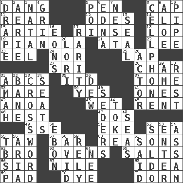 ACROSS 1. Mild oath, euphamism for damn 5. Animal enclosure 8. Head covering 11. Tail end 12. Lyric poems 14. Connecticut Ivy Leaguer 15. Nick name for Arthur 17. Remove soap 18. Trim (branches) 19. Player piano 21. "One Day ___ Time" 22. Area sheltered from the wind 23. Snakelike fish 24. Or not 25. Pet locale 27. Indian title of respect (Mr.) 28. Burn to charcoal 31. Lettered men learn these first 35. It would 37. Heavy book 38. Female horse 39. Consenting reply 41. Washington bills 42. Small Philippine buffalo 43. Dripping 45. Monthly bill 46. Behest 47. Two (Sp.) 49. Compass dir. 51. Supplement with great effort 52. Ocean 55. The 23rd letter of the Hebrew alphabet 57. Tavern 60. Thinks logically 62. Sis' sibling 63. Baking chambers 65. Table seasonings 66. Title for a knight 67. The longest river in the world 68. The main thing one is thinking about 69. Groovy apt. 70. Color 71. Dormintory (informal) DOWN 1. Window treatment 2. Nest on high 3. Brizilian seaport 4. Amused look 5. Luau course 6. Pulitzer Prize-winning author Ferber 7. Egg locale 8. Portable communications device 9. Medicinal plant 10. Corncob 13. Lick closed 16. Immeasurably long periods of time 17. Noteworthy scarcity 20. Australian parrot (variant) 26. Thespian 29. So be it 30. Relief 31. Nursemaid 32. Object of repulsion 33. What you're doing now 34. Theater features 36. Morning condensation 40. Spring feasts 44. Puff or smoke 48. Oceans 50. Inky black, to poets 52. Twentieth part of a lira 53. Keyboard key 54. Indian state 55. Cook's measure (abbr.) 56. Operatic vocal solo 58. Enthusiastic 59. Have trust in 61. Alleged 64. Born