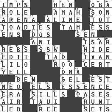 ACROSS 1. Naughty children 5. Layer 8. Chief or king in Benin or Nigeria 11. Hero or heavy, e.g. 12. Nanny 14. Boy, to dad 15. Sports stadium 17. Place in a line 18. Small child 19. Sycophants 21. Scottish cap 22. Curvy letter 23. Followers of ems 24. Two (Sp.) 25. Elected rep. 27. Black tropical American cuckoo 28. Russian ruler of old 31. Confederate soldiers (slang) 35. Compass dir. 37. Flintstone garb 38. Prepare for publication 39. Small amount or degree 41. _ the terrible 42. _ and Stitch 43. Friend of Pooh 45. Certainty 46. Shout 47. Heredity factor (abbr.) 49. Benjamin's nick name 51. Set 52. Eastern Standard Time (abbr.) 55. Modern: prefix 57. Raised railways 60. Substance 62. Epoch 63. Beverly of Met fame 65. Fertile tracts in a desert 66. Atmosphere 67. "Change" in Tahitian 68. The smallest animal of a litter 69. Directed 70. To riddle 71. Puts into a specified state DOWN 1. Feeling or showing extreme anger 2. Person of subnormal intelligence 3. Entreaties 4. Transmit 5. Actor Linden 6. Give off 7. Grandmother 8. Clearly or manifestly demonstrative 9. Scornful sounds 10. Pismires 13. Is hesitant and indecisive 16. Opera by Verdi 17. Aid 20. Immeasurably long periods of time 26. Value system 29. The sixth month of the Jewish calendar 30. Monthly bill 31. Have trust in 32. Singer Brickell 33. Big road sign 34. Fur scarf 36. Armed conflict 40. Evades 44. Washington bills 48. In addition 50. Egg locale 52. Follow as a consequence or result 53. Odor 54. Trials 55. Actress Patricia 56. One of the Great Lakes 58. One who doesn't tell the truth 59. Change direction abruptly 61. Hearing organs 64. Whopper