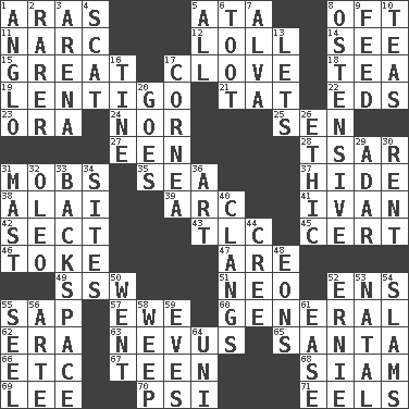 ACROSS 1. Caspian sea tributary 5. _ moment's notice (2 wds.) 8. Often (poetically) 11. Drug cop 12. Hang loosely or laxly 14. Perceive with the eye 15. Relatively large 17. Garlic unit 18. Beverage made from leaves 19. Small, flat, pigmented spot on the skin 21. Make lace 22. Begley and Asner 23. Mouth or opening 24. And not 25. Elected rep. 27. Car or cant ending 28. Russian ruler of old 31. Crowds into 35. Ocean 37. Flintstone garb 38. Jai ____ 39. Curve 41. _ the terrible 42. Religious group 43. Affectionate concern, for short 45. Sure thing 46. Casino tip 47. "We ___ not amused" (Victoria) 49. Compass dir. 51. Modern: prefix 52. Followers of ems 55. Plant excrement 57. She-sheep 60. Commissioned military rank 62. Period 63. Mole, birthmark 65. Before Barbara or Clara 66. And so on (abbr.) 67. Adolescent 68. Thailand, formerly 69. Area sheltered from the wind 70. Air pressure measure (abbr.) 71. Snakelike fish DOWN 1. White American of non-Hispanic descent 2. More uncommon 3. Sports stadium 4. Get outta here! 5. Everything 6. A blast of a horn 7. Inventor's middle name 8. Clearly or manifestly demonstrative 9. Nourish 10. Afternoon social gatherings 13. Allows 16. Prong on a fork 17. Pupil covering 20. Leaves 26. Value system 29. The sixth month of the Jewish calendar 30. Monthly bill 31. Vertical spar for supporting sails 32. Butter sub 33. Keyboard key 34. Settings 36. Tate display 40. Rigngs loudly 44. Algonquian 48. Immeasurably long periods of time 50. Gone 52. Bert's buddy 53. Brizilian seaport 54. Criticizes harshly 55. Stitch closed the eyes of (a falcon) 56. Johnson of "Laugh-In" 58. Shed a tear 59. Nights before holidays 61. Relaxation 64. Single; one (prefix)