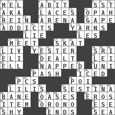 ACROSS 1. Cartoonist voice _ Blanc 4. "This won't hurt ____!" 8. Fast jet (abbr.) 11. Alias (abbr.) 12. Shoestrings 14. Brightly colored fish 15. It's straight from the horse's mouth 17. Sports stadium 18. Yawn 19. Inveterate users 21. Tall tales 23. Untruth 24. French article 25. Rendezvous 27. Three-handed card game 30. 54 in ancient Rome 31. Of or pertaining to yesterday 34. Indian title of respect (Mr.) 37. Biblical high priest 38. Started a card game 39. Luau accessory 40. Pipe bend 41. Slept 43. University (slang) 44. Romantic infatuation 45. On the rocks 47. Personal Computers (abbr.) 49. Luau course 50. Ms. Damita and namesakes 52. French poetic form 56. Object of repulsion 57. Fertile tracts in a desert 60. Greek god of love 61. Detail 62. U. of Maine site 63. Compass dir. 64. Like a shrinking violet 65. Conclusions 66. Ocean DOWN 1. Hindu Mythology: god of death 2. Made supply last 3. Put down 4. Having winglike extensions 5. Soap units 6. Frozen water 7. "___ Little Indians" 8. Connects, as a bridge 9. Plant excrements 10. Definite Article 13. Declare 14. Legendary monster 16. Mediterranean tributary 20. Municipality 22. Keyboard modifier key 25. Place where flour is made 26. Morally bad or wrong 27. Staphylococcus 28. Seaweed 29. Johnson of "Laugh-In" 30. Area sheltered from the wind 32. Pulitzer Prize-winning author Ferber 33. Oceans 34. Turn sharply 35. Tear apart 36. One more than two 42. "Vaya con ____" 44. Air pressure measure (abbr.) 46. Quote 47. Abounding in pines 48. To starve (Brit.) 49. Mexican monetary units 50. Thin strip of wood or metal 51. "Barney Miller" actor Jack 52. Post 53. Angers 54. Sense of smell 55. Toward the sea 56. Again 58. "We ___ not amused" (Victoria) 59. Boy, to dad