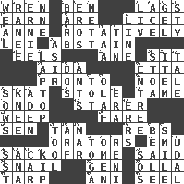 ACROSS 1. Songbird 5. Benjamin's nick name 8. Falls behind 12. Merit 13. "We ___ not amused" (Victoria) 14. It is permitted: Lat. 15. Queen of England 1702-14 16. Producing rotation 19. Flowery wreath 20. Choose not to consume 21. Snakelike fish 23. One (Scot) 24. Be seated 27. Opera by Verdi 30. Singer James 31. Right away 34. Christmas carol 35. Three-handed card game 38. Fur scarf 40. Docile 41. Southwest Nigerian state 42. A viewer who gazes fixedly 44. Shed a tear 45. Conductor's collection 46. Elected rep. 47. Scottish cap 50. Confederate soldiers (slang) 53. Speakers 57. Australian flightless bird 59. Italian handbag shop? 63. Alleged 64. Slow-paced one 65. Commissioned military rank (abbr.) 66. Spanish pot 67. Canvas cover 68. Black tropical American cuckoo 69. Sew up the eyelids of hawks and falcons DOWN 1. Welt 2. Indian princess (variant) 3. Bert's buddy 4. Compass dir. 5. Sharp remark 6. Greek god of love 7. Remaining after all deductions 8. 54 in ancient Rome 9. Adept person 10. Set 11. Filthy place 14. Actor's bit 17. American Automobile Association (abbr.) 18. Metal container 20. SW Saudi Arabia district 22. Portable computer 24. Portico 25. A distinct part 26. Lie 28. Two (Sp.) 29. Pismires 30. Main course 32. Small child 33. Norwegian king 35. Sty mamas 36. Leg joint 37. An important port of Yemen 39. Epoch 43. Blunders 47. Implement 48. Sandy's bark 49. Third mo. 51. Memphis, Tenn. Street 52. Grin 54. Ancient Roman robe 55. Sign of something about to happen 56. Painter Guido (1575-1642) 58. Freehold land 59. Fast jet (abbr.) 60. Santa ___, CA 61. 4-wheeled motor vehicle 62. Monetary unit of Laos 63. Mayday
