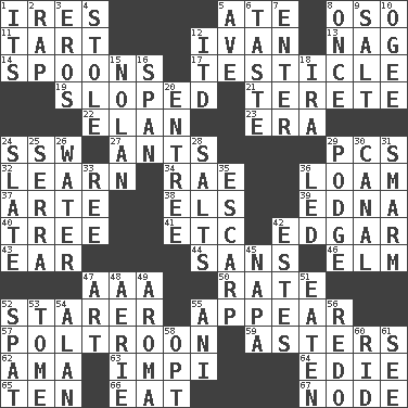 ACROSS 1. Angers 5. Had dinner 8. Bear (Spanish) 11. Small pie 12. _ the terrible 13. Tired old horse 14. Soup utensils 17. One of the two male reproductive glands 19. Had an oblique or slanted direction 21. Cylindrical with tapered ends 22. Enthusiasm 23. Period 24. Compass dir. 27. Pismires 29. Personal Computers (abbr.) 32. Memorize 34. Actress Charlotte 36. Rich soil 37. Johnson of "Laugh-In" 38. Raised railways 39. Pulitzer Prize-winning author Ferber 40. Woody plant 41. And so on (abbr.) 42. _ Allan Poe 43. Ewer handle 44. Without 46. Shade tree 47. Auto club (abbr.) 50. Pace 52. A viewer who gazes fixedly 55. Seem 57. Coward 59. Michaelmas daisies 62. Nursemaid (var.) 63. Body of Kaffir warriors 64. Singer Brickell 65. Nine, plus one 66. Erode 67. Thickened enlargement DOWN 1. It is 2. Reproach for some lapse or misdeed 3. Greek god of love 4. Took without asking 5. "___ Maria" 6. Clothes sense 7. Keyboard key 8. At one time in the past 9. Table seasoning 10. Double curve, resembling the letter S 12. It would 15. Pitcher Ryan 16. Connect, as a bridge 18. Lyricist Gershwin 20. Main course 24. Schedule 25. Father Junipero _ 26. Wetness 28. Table seasonings 29. Plash 30. Lessep's creation 31. Excessive but superficial compliments 33. To riddle 35. Fortification 36. Directed 42. _____ Park, CO 45. California wine valley 47. Tate display 48. Nest on high 49. Scent 51. Consumed 52. Petty quarrel 53. Heavy book 54. Actor Alda or Thicke 55. Black tropical American cuckoo 56. Redecorate 58. Choose 60. To free from 61. Observe