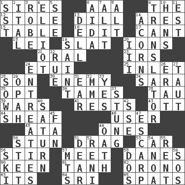 ACROSS 1. Founders of families 6. American Automobile Association (abbr.) 9. Definite Article 12. Fur scarf 13. Deli pickle 14. Ancient Greek god of war 15. Eating place 16. Prepare for publication 17. Patter 18. Flowery wreath 19. Narrow board 20. Charged atoms 21. Relating to the mouth 23. Big collection agency 24. Needle case 25. An arm off of a larger body of water 28. Boy, to dad 30. Foe 34. "Two Mules for Sister ____" 35. Choose 36. Domesticates 38. The 19th letter of the Greek alphabet 39. Armed conflicts 41. Musical pauses 43. Baseball player Mel 44. Archer's quiver 46. One who makes use of a thing 48. "One Day ___ Time" 49. Singles 50. Astound 51. To be drawn or hauled along 53. Automobile 56. Use a spoon 57. Confront 58. Natives or inhabitants of Denmark 60. Peachy ____! 61. Hyperbolic tangent 62. U. of Maine site 63. ___ a Wonderful Life 64. _ Lanka 65. Arguments over trivial matters DOWN 1. Fast jet (abbr.) 2. Slanted text style (abbr.) 3. Loose flowing garment 4. American author Paul (1891-1958) 5. Perceive with the eye 6. Opera by Verdi 7. Set down 8. The first octave above the treble staff 9. Interpreter 10. Coop moms 11. Eastern Standard Time (abbr.) 13. Small valley 14. Oak nuts 19. Inhabitant of Heaven 20. One more than two 22. Sorrow 24. Pleas 26. Part of Q.E.F. 27. Tense 28. Sty mamas 29. Brightly colored fish 31. Ewer handle 32. Madame (abbr.) 33. It is so 37. Feeling sharp psychological pain 40. Titan orbits this 42. Compass dir. 45. Avid follower 47. Fortification 49. Pledge 50. Proofreading order 51. Letter starter 52. Painter Guido (1575-1642) 54. Small Philippine buffalo 55. Monthly bill 56. What Jean-Claude Killy likes to do 57. Mountains (abbr.) 58. Two (Sp.) 59. Mayday