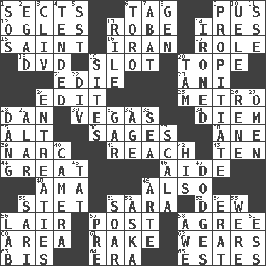 ACROSS 1. Religious groups 6. Label 9. Ichor 12. Stares at amorously 13. Loose flowing garment 14. Angers 15. Virtuous person 16. SW Asia republic 17. Hero or heavy, e.g. 18. Movie disc 19. Narrow opening 20. Drink excessively 21. Singer Brickell 23. Black tropical American cuckoo 24. Prepare for publication 25. Paris' subway 28. Daniel's nick name 30. Viva Las _ 34. South Vietnam president (1954) 35. Keyboard modifier key 36. Gurus 38. A saturated hydrocarbon 39. Drug cop 41. Arrive at 43. Nine, plus one 44. Relatively large 46. Helper 48. Nursemaid (var.) 49. In addition 50. Proofreading order 51. "Two Mules for Sister ____" 53. Morning condensation 56. Den 57. Mail 58. Match 60. Length times width 61. Immoral or dissolute person 62. Puts on (as clothing) 63. Again 64. Epoch 65. _____ Park, CO DOWN 1. Distress signal 2. Mild oath 3. 154 in Roman numerals 4. Looked after 5. Fast jet (abbr.) 6. "Corrida" creature 7. Blind as ____ 8. Commissioned mil. rank 9. Conciliate 10. Ubangi River tributary 11. Compass dir. 13. Cause heat under the collar 14. Pressed 19. Locates 20. Scottish cap 22. HTML Container Element 24. Pleas 26. French philosopher Descartes 27. Presage 28. Mild oath, euphamism for damn 29. Having or resembling wings 31. Slender fish 32. Mature 33. Ocean 37. Any of the three canals of the cochlea 40. Device for capturing images 42. Part of HMS, perhaps 45. Make lace 47. Evades 49. Johnson of "Laugh-In" 50. Indian skirt 51. Fly high 52. "____ silly question..." 54. Part of Q.E.F. 55. We are 56. Experiment locale 57. Before (prefix) 58. Deep reverence 59. Double-curved letter