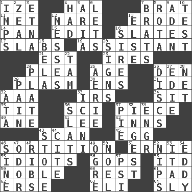 ACROSS 1. Ending with capital 4. Actor Linden 7. Naughty child 11. Was introduced to 12. Female horse 13. Eat (away) 14. Baking dish 15. Prepare for publication 16. Chalkboards 17. Broad, flat, thick pieces 19. Aide 21. Eastern Standard Time (abbr.) 23. Angers 24. Entreaty 25. Grow older 26. Lair 29. Suffix with ecto or cyto 30. Followers of ems 31. Binary compound 32. American Automobile Association (abbr.) 33. Big collection agency 34. Be seated 35. Teat (slang) 36. _-fi 37. Part 40. One (Scot) 41. Area sheltered from the wind 42. Lodging establishments 43. Examine minutely or intensely 45. Oval reproductive body of a fowl 46. Casting lots 51. Bert's buddy 55. Foolish or stupid persons 56. Republicans 58. It would 59. Having high moral qualities 60. Respite 61. Groovy apt. 62. Celtic language 63. Connecticut Ivy Leaguer 64. Roguish DOWN 1. Naughty children 2. Ardor 3. Inactive volcano in Sicily 4. Possessed 5. Operatic vocal solo 6. Allows 7. Naughty children 8. Roll call or roster of names 9. Arabian gulf 10. Trial 12. Makes clutter 13. Otherwise 16. Begets 18. Actor Lugosi 20. Attaches a signature 22. Scottish cap 24. Food holder 25. Nest on high 26. Flat circles 27. Singer Brickell 28. Fish or hair follower 29. Ache 32. _ moment's notice (2 wds.) 33. Ancient Celtic tribe of eastern Britain 36. Narrow boards 37. Sliced dessert 38. Consume 39. Engineer (abbr.) 43. Took without asking 44. Quote 46. Trig term 47. Aroma 48. Chest bones 49. Legendary monster 50. Christmas carol 52. Pinches, bites 53. Slanted text style (abbr.) 54. Whirlpool 57. Air pressure measure (abbr.)