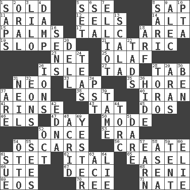 ACROSS 1. Disposed of to a purchaser 5. Compass dir. 8. Plant excrement 11. Operatic vocal solo 12. Snakelike fish 14. Keyboard modifier key 15. Insides of hands 17. Baby powder 18. Type of rug 19. Slanted 21. Of or pertaining to medicine 23. Fish or hair follower 25. Norwegian king 26. Capri or Wight 27. Small amount or degree 28. Keyboard key 31. Modern: prefix 33. Pet locale 35. Dinah or Pauly 37. Period of immesurable duration 38. Fast jet (abbr.) 40. SW Asia republic 41. Remove soap 43. Make lace 45. Two (Sp.) 46. Raised railways 47. 24 hours 50. Method 52. At one time in the past 53. Period 54. Motion picture awards 56. Cause to be 61. Proofreading order 62. Slanted text style (abbr.) 65. Artist's stand 66. Shoshoni 67. Tenth: prefix 68. Painter Guido (1575-1642) 69. Greek goddess of the dawn 70. To sift 71. Nathan's nickname DOWN 1. Plant excrements 2. Of the mouth 3. _ and Stitch 4. Moist 5. Put into a specified state 6. Ocean 7. American author Paul (1891-1958) 8. Indian skirt 9. Actor Baldwin 10. Parent Teacher Association (abbr.) 13. Any of the three canals of the cochlea 16. Elected reps. 18. Sandy's bark 20. Small valley 22. Small amounts or degrees 24. Beverages made from leaves 26. Charged particles 28. "Corrida" creature 29. Ancient river in northeast Turkey 30. Benjamin's nick name 31. Famous astronaut Armstrong 32. Immeasurably long periods of time 34. Pacific Standard Time (abbr.) 36. Flintstone garb 37. "We ___ not amused" (Victoria) 39. Not wild 42. Pulitzer Prize-winning author Ferber 44. Torque (variant) 48. Sour-tasting 49. Next before 51. Have the gumption 52. Sep. follower 54. "Beetle Bailey" pooch 55. Observes 57. Merit 58. At sea 59. Portable shelter 60. Writer Wiesel 61. Take to court 63. Adept person 64. Untruth