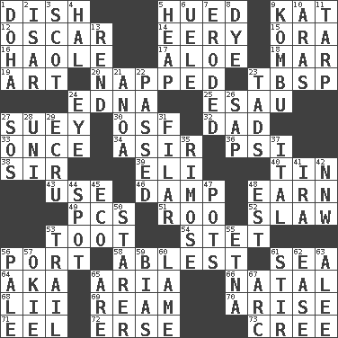 ACROSS 1. Food container 5. Became colored 9. Krazy ___ of comics 12. Motion picture award 14. Suggestive of the supernatural 15. Mouth or opening 16. White Person, in Hawaii 17. _ vera 18. Third mo. 19. Tate display 20. Slept 23. Cook's measure (abbr.) 24. Pulitzer Prize-winning author Ferber 25. Son of Isaac 27. Chop _ 30. Order of Saint Francis (abbr.) 32. Male parent 33. Single time 34. SW Saudi Arabia district 36. 23rd letter of the Greek alphabet 38. Title for a knight 39. Connecticut Ivy Leaguer 40. Shallow baking pan 43. Purpose 46. Moist 48. Merit 49. Personal Computers (abbr.) 51. Friend of Pooh 52. Cole _ (cabbage dish) 53. A blast of a horn 54. Proofreading order 56. Left side of a ship or aircraft 58. Most capable 61. Ocean 64. Alias (abbr.) 65. Operatic vocal solo 66. Brizilian seaport 68. Cards in a Roman deck? 69. 480, 500 or 516 sheets of paper 70. Originate 71. Snakelike fish 72. Celtic language 73. Algonquian DOWN 1. Capital of the state of Qatar 2. Austrian river, tributary to the Danube 3. Highlander 4. Actor Linden 5. Pile 6. Ubangi River tributary 7. Worn away 8. Color 9. Dried seaweed eaten as food 10. Caspian sea tributary 11. Canvas cover 13. Tear apart 21. Small Philippine buffalo 22. Went by 23. Bits 24. Sight organ 26. Plant excrement 27. Mayday 28. Corn or form start 29. Shade of tan 31. Of or pertaining to a thread or threads 35. Full of chinks, cracks, or crevices 37. Slanted text style (abbr.) 41. Retirement account (abbr.) 42. Compass dir. 44. Blemish 45. Environmental prefix 47. Plant holders 48. Eastern Standard Time (abbr.) 50. A viewer who gazes fixedly 53. Lag or linger behind 55. Inactive volcano in Sicily 56. Diluted with white 57. Migrant worker of the '30s 59. Prejudice 60. Unable to walk 61. Disorderly outburst 62. Comfort 63. Toward shelter 65. "We ___ not amused" (Victoria) 67. Curve