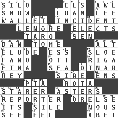 ACROSS 1. Grain storage tower 5. Raised railways 8. Leather borer 11. Overwhelm 12. Rich soil 13. Area sheltered from the wind 14. Place for singles 17. Event 19. Poe poem 21. Opts 22. Edible starchy tuberous root 23. Elected rep. 24. Daniel's nick name 27. Heavy book 29. The first octave above the treble staff 32. Evade 34. Double-curved letter 36. _ gin 37. Papal veil 38. Baseball player Mel 39. Port city in Latvia 40. Inactive volcano in Sicily 41. Ocean 42. Middle Eastern gold or silver currency 43. Marina Del _, California 44. Title for a man of rank and authority 46. Followers of ems 47. Parent Teacher Assoc. 50. Round or rotation of duties 52. A viewer who gazes fixedly 55. Michaelmas daisies 57. News announcer 59. Threatening words 62. ___ a Wonderful Life 63. Drop; flow; fall 64. Good sense 65. Perceive with the eye 66. Snakelike fish 67. Collude with DOWN 1. Compass dir. 2. _ tizzy (2 wds.) 3. Hang loosely or laxly 4. A small or young owl 5. Period of immesurable duration 6. Shoestrings 7. Grin 8. Actor Baldwin 9. Gone 10. Allows 12. Falsehood 15. Maternal 16. "Corrida" creature 18. Lair 20. Lover boys 24. Postpone 25. Having winglike extensions 26. Pet term 28. _____ Park, CO 29. Place in a line 30. Utah city north of Ogden 31. Pulls apart 33. ___ good deed 35. Flight of steps 36. _ Lanka 42. Prevent from occurring 45. Printing process, for short 47. Adept person 48. Laconic 49. Nick name for Arthur 51. Sports stadium 52. Indian titles of respect 53. Wig 54. Domed church section 55. "We ___ not amused" (Victoria) 56. Messy guy 58. Pipe bend 60. Take to court 61. Eastern Standard Time (abbr.)