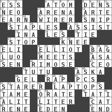 ACROSS 1. Curvy letter 4. Tiny particle 8. Hiding places for outlaws 12. Modern: prefix 13. Sports stadium 14. Johnson of "Laugh-In" 15. Merit 17. One who wires 18. Sever or remove by pinching or nipping 19. Paper fasteners 21. Aid 23. _ tizzy (2 wds.) 24. French article 26. Neckwear 27. Constrict 28. Leg joint 30. Biblical high priest 31. American author Paul (1891-1958) 34. Container for groceries 37. Nilotic language 38. Confronts 39. White ___ sheet 40. Elected rep. 41. Full of chinks, cracks, or crevices 42. Corporate head (abbr.) 43. Ballerina skirt 44. "____ silly question..." 46. Set 47. Reproach for some lapse or misdeed 50. Personal Computers (abbr.) 51. A viewer who gazes fixedly 54. Portable computers 57. Not wild 58. Speak pompously 60. Jacques of French films 62. Set down 63. 61 cubic inches 64. Domesticated feline 65. French philosopher Descartes 66. Genesis locale 67. Conclude DOWN 1. Compass dir. 2. Oceans 3. Casting lots 4. Satellite of Uranus 5. Laconic 6. Single 7. Hindu Mythology: god of death 8. Small ungulate mammals of Africa 9. Bert's buddy 10. Nuclear Threat Initiatives 11. Back-to-school mo. 13. Leather borer 16. Billionth: prefix 20. Infant food 22. Proofreading order 25. Burlesque acts 27. Turn sharply 29. Characteristic smell of wine 30. Raised railways 31. Send forth 32. Arboreal primate 33. Lion 34. Keyboard key 35. Toward the sea 36. E Mali city 41. Court order 43. Cigar-shaped 44. Fitting 45. Highlander 46. Street urchin 48. Having winglike extensions 49. Eucharist need 51. Play the lead 52. Lie 53. Hero or heavy, e.g. 55. For each 56. Comedian Laurel of Laurel & Hardy 59. To free from 61. It would