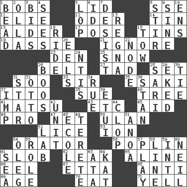 ACROSS 1. Moves up and down 5. Flaplike covering 8. Compass dir. 11. Writer Wiesel 12. Baltic tributary 14. Metal container 15. Tree or shrub in the Birch family 17. Airs 18. Airtight sealed metal containers 19. Hyrax 21. Refuse to acknowledge 23. Lair 25. Overwhelm 26. Waist strap 27. Small amount or degree 28. Arrange properly for use 31. "Barney Miller" actor Jack 33. Title for a knight 35. 1973 Nobel Price Winner (Physics) Leo 37. "Tell ____ the Marines!" 38. Institute legal proceedings 40. Relationship diagram 41. Taiwanese island in East China Sea 43. And so on (abbr.) 45. Help 46. Adept person 47. Fish or hair follower 50. ____ Bator, Mongolia 52. Louse (plural) 53. Electrically charged atom 54. Speaker 56. Cotton for raincoats, e.g. 61. Oscar Madison type 62. Path through which fluid escapes 65. Place in a line 66. Snakelike fish 67. Singer James 68. Against 69. Personal question 70. Consume 71. Shout DOWN 1. Necklace unit 2. Water jar 3. Auction offers 4. Perceives with the eye 5. Chop off 6. Wedding promise 7. Stop 8. Agitate 9. Trig term 10. Followers of ems 13. Rain (Swedish) 16. Travel on an animal 18. Pull behind 20. Snakelike fish 22. Thickened enlargement 24. Nuclear Threat Initiatives 26. Expressions of contempt or scorn 28. Indian skirt 29. Made supply last 30. Make a knot 31. Play the lead 32. Von Bismarck 34. Regret 36. Comedian Laurel of Laurel & Hardy 37. Mischievous child 39. Needle case 42. A single undivided whole 44. Hoof sound 48. Learning spot: Fr. 49. Cylindrical with tapered ends 51. Small Philippine buffalo 52. Experiment locale 54. Cassini of fashion 55. Hero or heavy, e.g. 57. Shaw product 58. Actor's bit 59. International (abbr.) 60. Famous astronaut Armstrong 61. Ocean 63. "One Day ___ Time" 64. Krazy ___ of comics