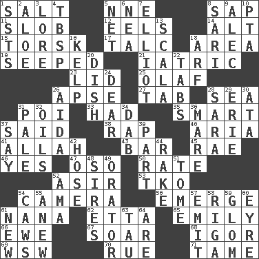 ACROSS 1. Table seasoning 5. Compass dir. 8. Plant excrement 11. Oscar Madison type 12. Snakelike fish 14. The first octave above the treble staff 15. Cod relative 17. Baby powder 18. Type of rug 19. Oozed 21. Of or pertaining to medicine 23. Flaplike covering 25. Norwegian king 26. Domed church section 27. Bar bill 28. Ocean 31. Luau course 33. Possessed 35. Don Adams' spy role 37. Alleged 38. Hit sharply and swiftly 40. Operatic vocal solo 41. Assad's deity 43. Tavern 45. Actress Charlotte 46. It is so 47. Bear (Spanish) 50. Assign a rank or rating to 52. SW Saudi Arabia district 53. Ring climax 54. Device for capturing images 56. Develop 61. Grandmother 62. Singer James 65. Poet Dickinson 66. She-sheep 67. Fly high 68. Composer Stravinsky 69. Compass dir. 70. Sorrow 71. Docile DOWN 1. Fast planes 2. Medicinal plant 3. Old wives' tales, e.g. 4. Cook's measure (abbr.) 5. Fish or hair follower 6. Teachers' org. 7. American author Paul (1891-1958) 8. Indian skirt 9. Actor Baldwin 10. Parent Teacher Association (abbr.) 13. Any of the three canals of the cochlea 16. Seaweed 18. Sandy's bark 20. Food container 22. Bar bills 24. Letter starter 26. Opera by Verdi 28. "Two Mules for Sister ____" 29. One of the Great Lakes 30. _ moment's notice (2 wds.) 31. Light colored 32. Petroleums 34. Small moist lump or mass 36. Female horse 37. Declare 39. Component 42. Flexible conduit 44. Immoral or dissolute person 48. Begets 49. Speaker 51. Heavy book 52. Nanny (var.) 54. Crow sounds 55. Afresh 57. Send forth 58. Capital of Latvia 59. Seize upon or latch onto something 60. Jane of fiction 61. ___ Haven, CT 63. The 19th letter of the Greek alphabet 64. "We ___ not amused" (Victoria)